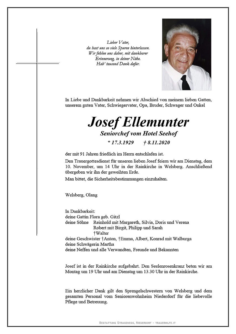 Den Trauergottesdienst für unseren lieben Josef feiern wir am Dienstag, dem 10. November, um 14 Uhr in der Rainkirche in Welsberg. Anschließend übergeben wir ihn der geweihten Erde.