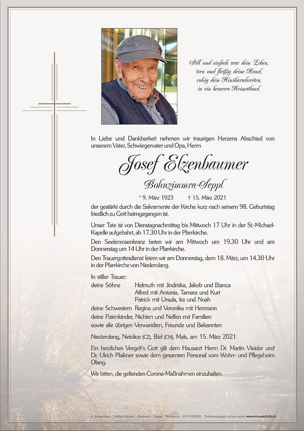 Den Trauergottesdienst feiern wir am Donnerstag, dem 18. März, um 14.30 Uhr in der Pfarrkirche von Niederolang.