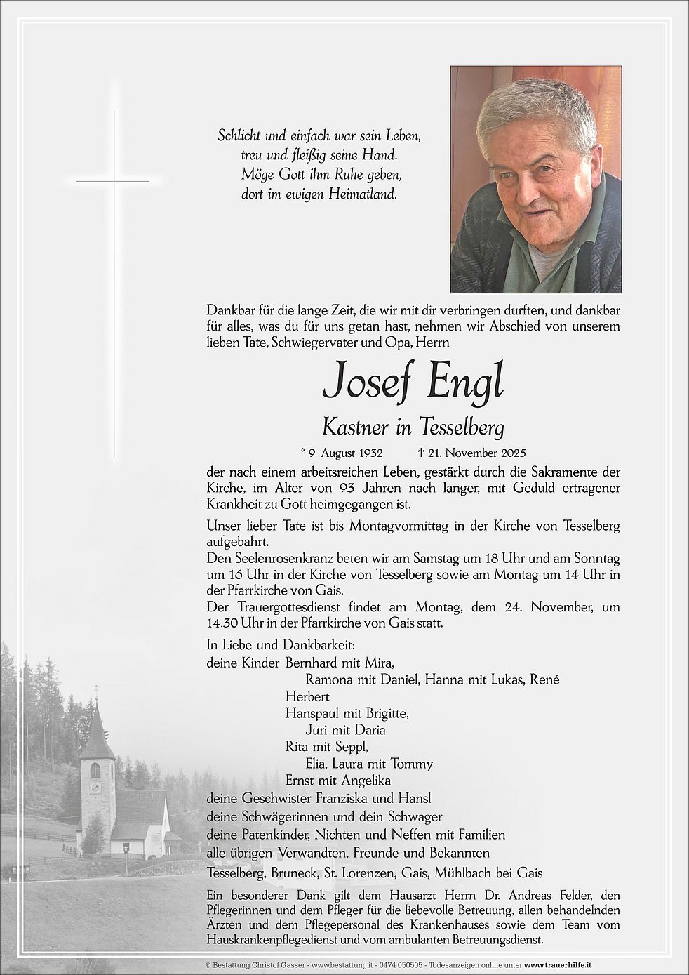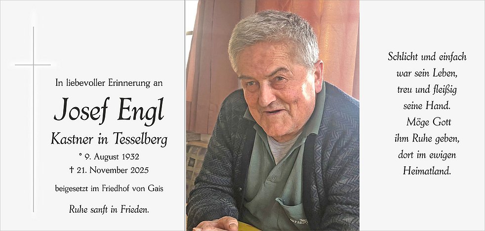 Der Trauergottesdienst findet am Montag, dem 24. November, um 14.30 Uhr in der Pfarrkirche von Gais statt.