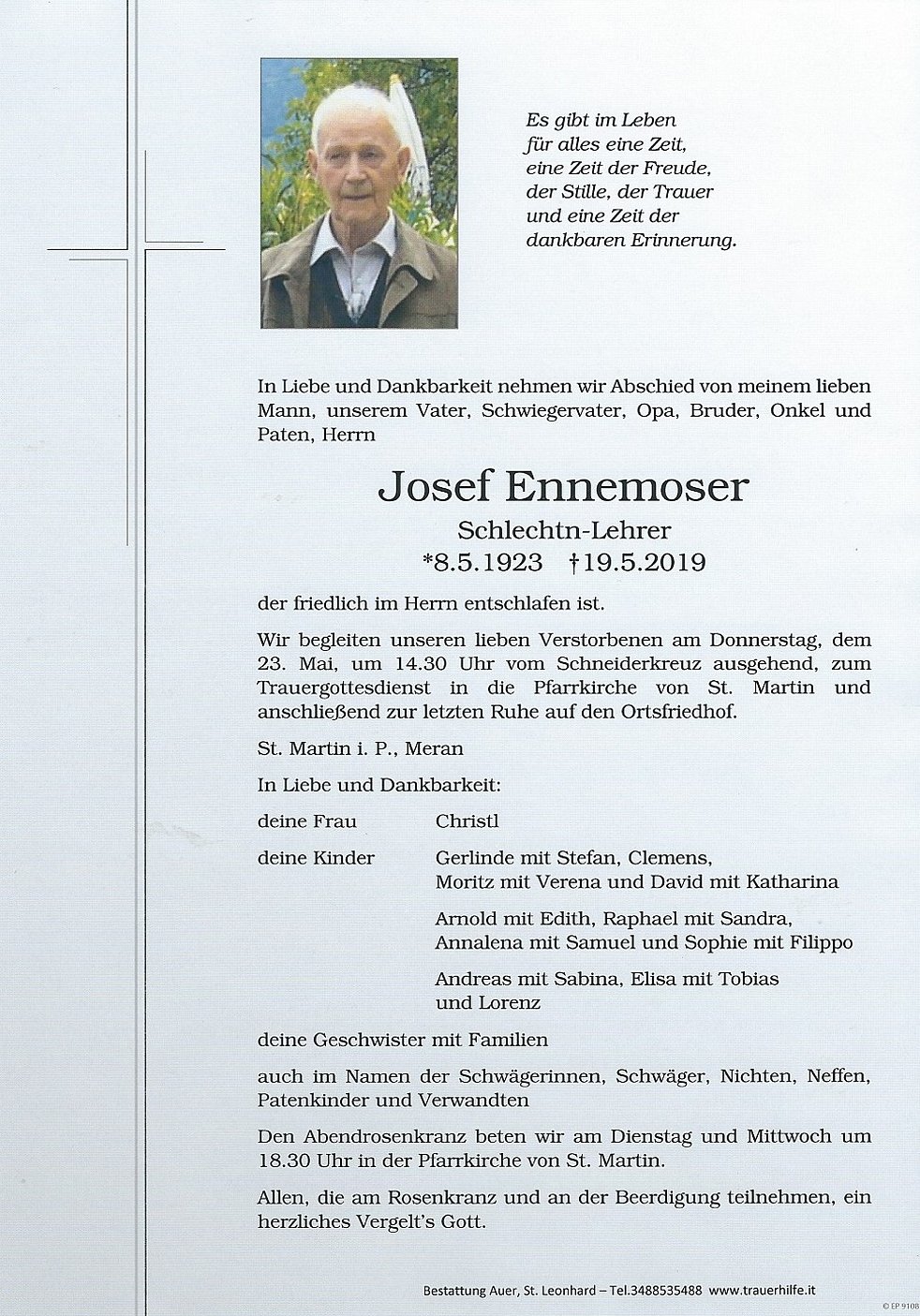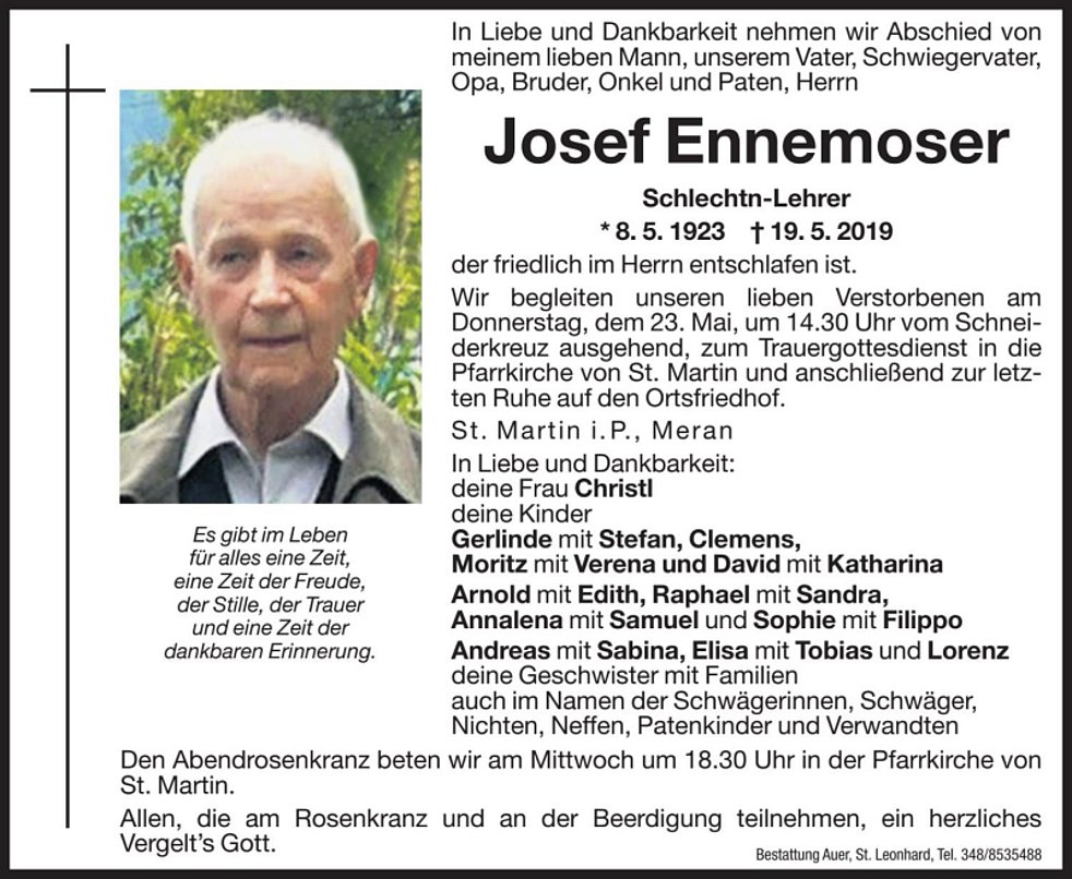 Wir begleiten unseren lieben Verstorbenen am Donnerstag, dem 23. Mai, um 14.30 Uhr vom Schneiderkreuz ausgehend, zum Trauergottesdienst in die Pfarrkirche von St. Martin und anschließend zur letzten Ruhe auf den Ortsfriedhof.