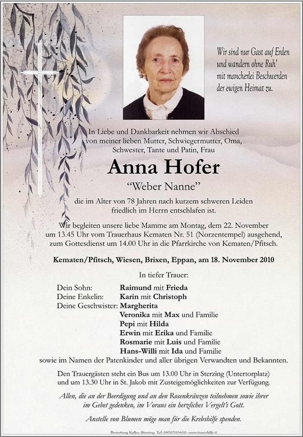 Wir begleiten unseren lieben Tate am Samstag, 6. November, um 13.45 Uhr vom Trauerhaus “Zingerlehof” ausgehend, zum Trauergottesdienst um 14.00 Uhr in die Wallfahrtskirche von Maria Trens und anschließend zur letzten Ruhe in den Ortsfriedhof.