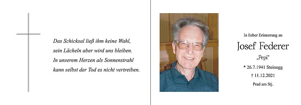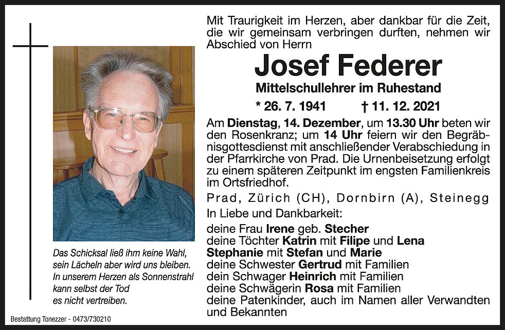 Am Dienstag, 14. Dezember, um 13.30 Uhr beten wir den Rosenkranz; um 14 Uhr feiern wir den Begräbnisgottesdienst mit anschließender Verabschiedung in der Pfarrkirche von Prad.