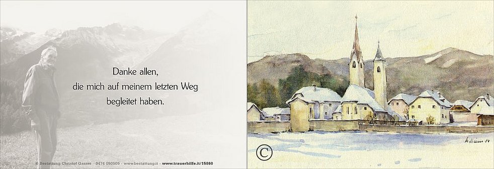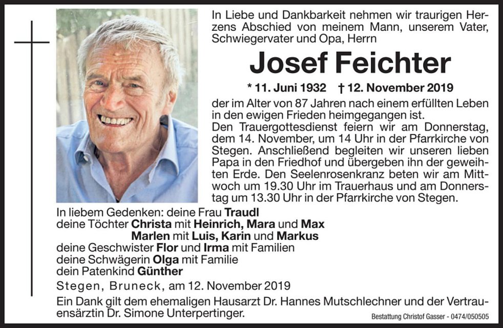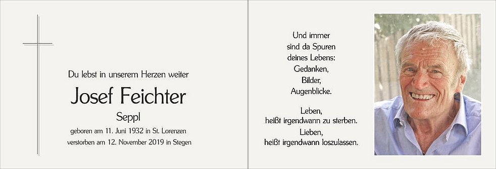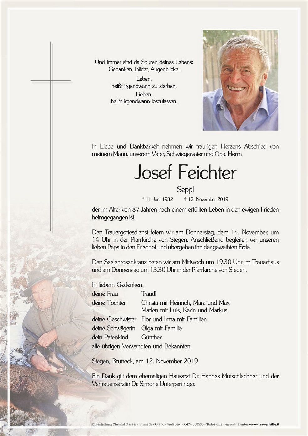 Den Trauergottesdienst feiern wir am Donnerstag, dem 14. November, um 14 Uhr in der Pfarrkirche von Stegen. Anschließend begleiten wir unseren lieben Papa in den Friedhof und übergeben ihn der geweihten Erde.