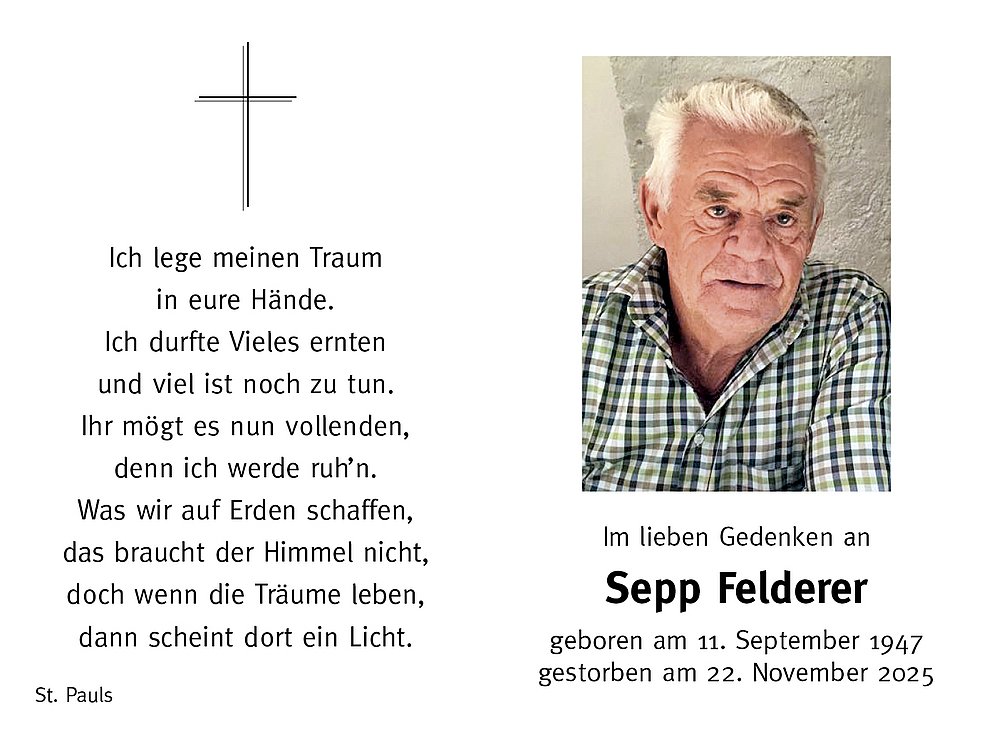 Wir verabschieden unseren Tata am Mittwoch, 26. November um 14:30 Uhr in der Pfarrkirche von St. Pauls und begleiten ihn anschließend zur letzten Ruhe auf den Friedhof.