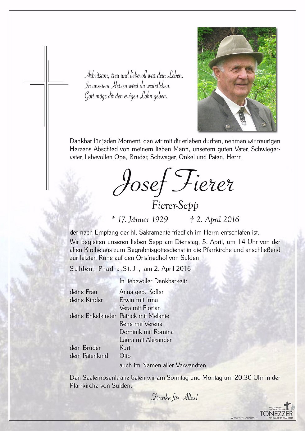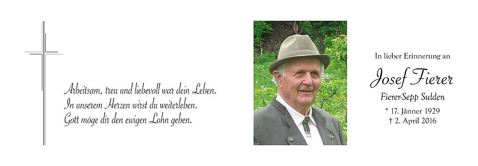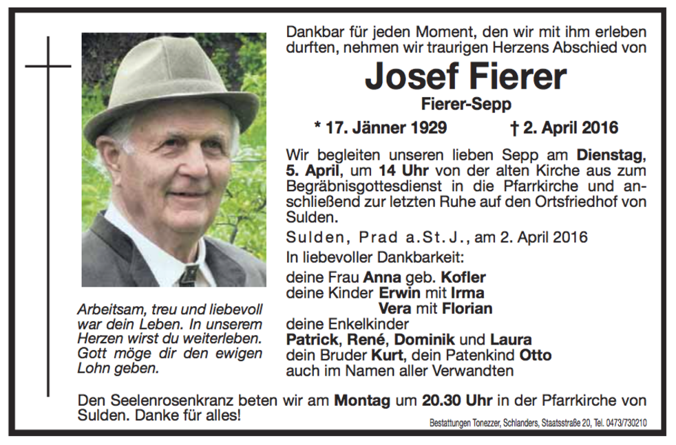 Wir begleiten unseren lieben Sepp am Dienstag, 5. April, um 14 Uhr von der alten Kirche aus zum Begräbnisgottesdienst in die Pfarrkirche und anschließend zur letzten Ruhe auf den Ortsfriedhof von Sulden.