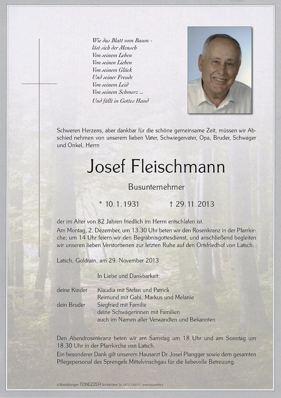 Am Montag, 2. Dezember, um 13.30 Uhr beten wir den Rosenkranz in der Pfarrkirche; um 14 Uhr feiern wir den Begräbnisgottesdienst, und anschließend begleiten wir unseren lieben Verstorbenen zur letzten Ruhe auf den Ortsfriedhof von Latsch.