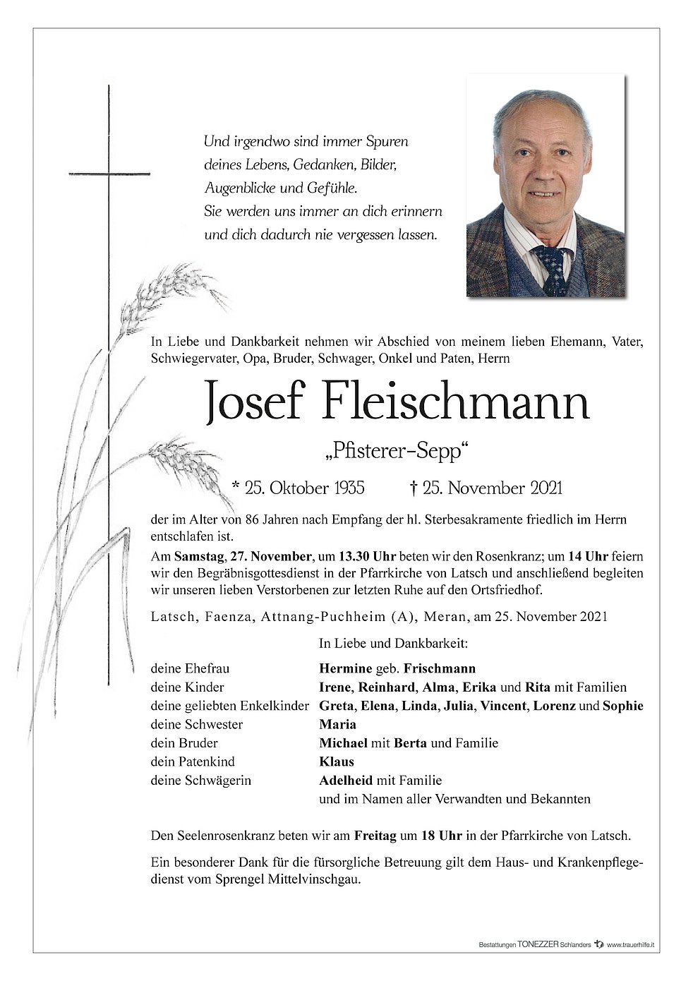 Am Samstag, 27. November, um 13.30 Uhr beten wir den Rosenkranz; um 14 Uhr feiern wir den Begräbnisgottesdienst in der Pfarrkirche von Latsch und anschließend begleiten wir unseren lieben Verstorbenen zur letzten Ruhe auf den Ortsfriedhof.