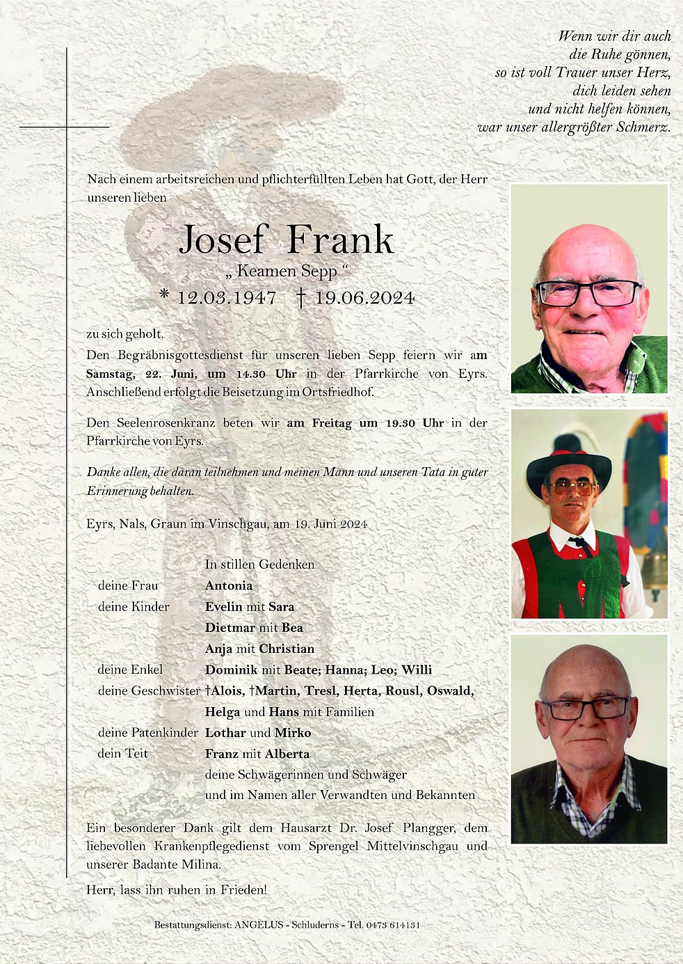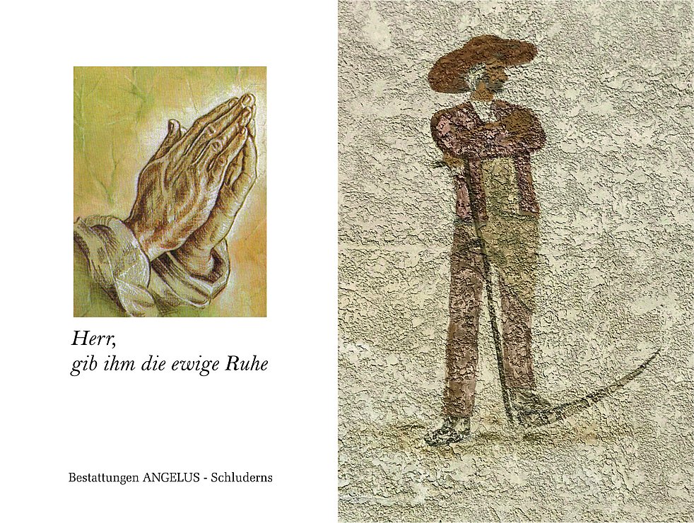 Mir betn, dass firn Seppl iaz die Himmlstür off geat, wou er mit olle liabm Leit, dia af ihm gwortet hobm wieder vereint isch in ewign Friedn und in Liacht va JESUS CHRISTUS, der für olle in Tod besiegt hot und durch seine Auferstehung a ihm s'Lebm in Herrlichkeit schenkt.
