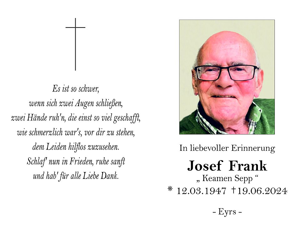 Mir sein a mit olle verbundn, dia fescht traurig sein und in Seppl vermissn und mechtn der gonzn Trauerfamilie inser herzlichs Beileid sogn. Möge enk der Glabm a Quelle der Kroft sein, dia enk Hoffnung und Trost spendet. Mir wearn ins ollm wieder in liebevolle Gefonkn an enkern Seppl erinnern.