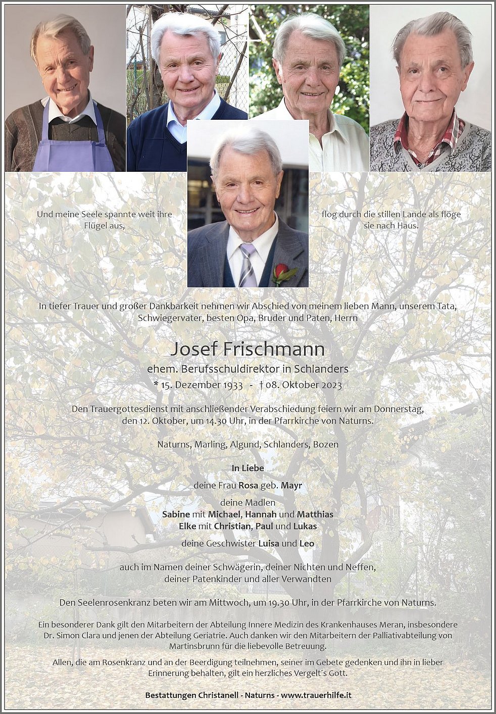 Den Trauergottesdienst mit anschließender Verabschiedung feiern wir am Donnerstag, den 12. Oktober, um 14.30 Uhr, in der Pfarrkirche von Naturns.