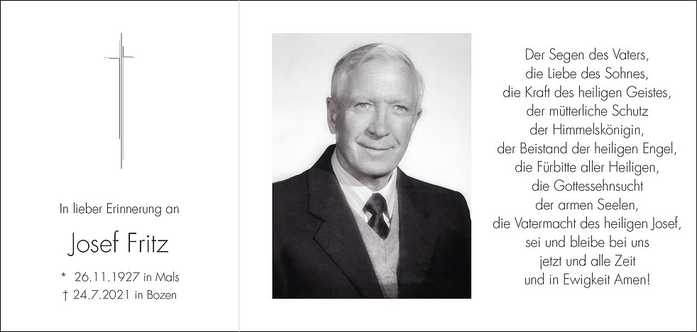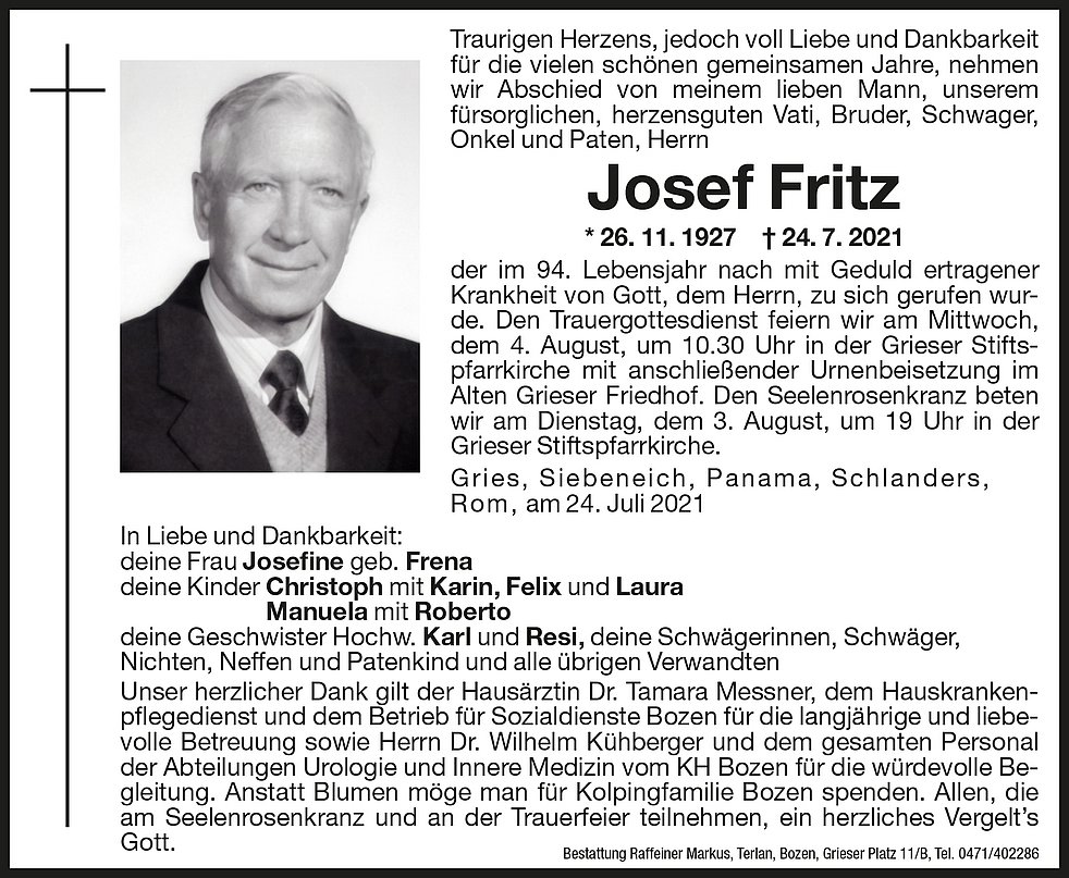 Unser herzlicher Dank gilt der Hausärztin Dr. Tamara Messner, dem Hauskrankenpflegedienst und dem Betrieb für Sozialdienste Bozen für die langjährige und liebevolle Betreuung sowie Herrn Dr. Wilhelm Kühberger und dem gesamten Personal der Abteilungen Urologie und Innere Medizin vom KH Bozen für die würdevolle Begleitung.
