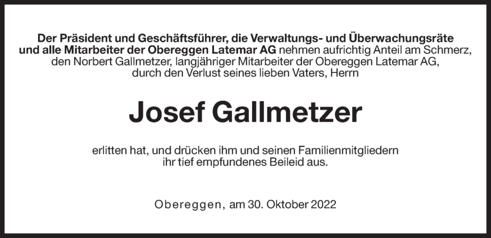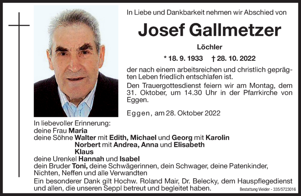 Den Trauergottesdienst feiern wir am Montag, dem 31. Oktober, um 14.30 Uhr in der Pfarrkirche von Eggen.