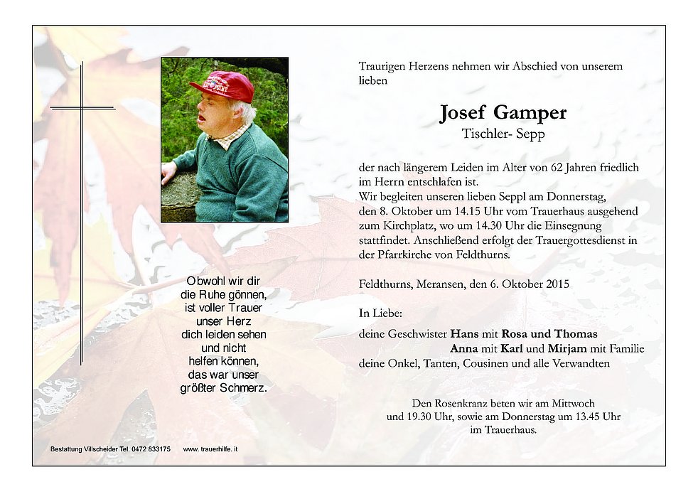 zum Kirchplatz, wo um 14.30 Uhr die Einsegnung stattfindet. Anschließend erfolgt der Trauergottesdienst in der Pfarrkirche von Feldthurns.