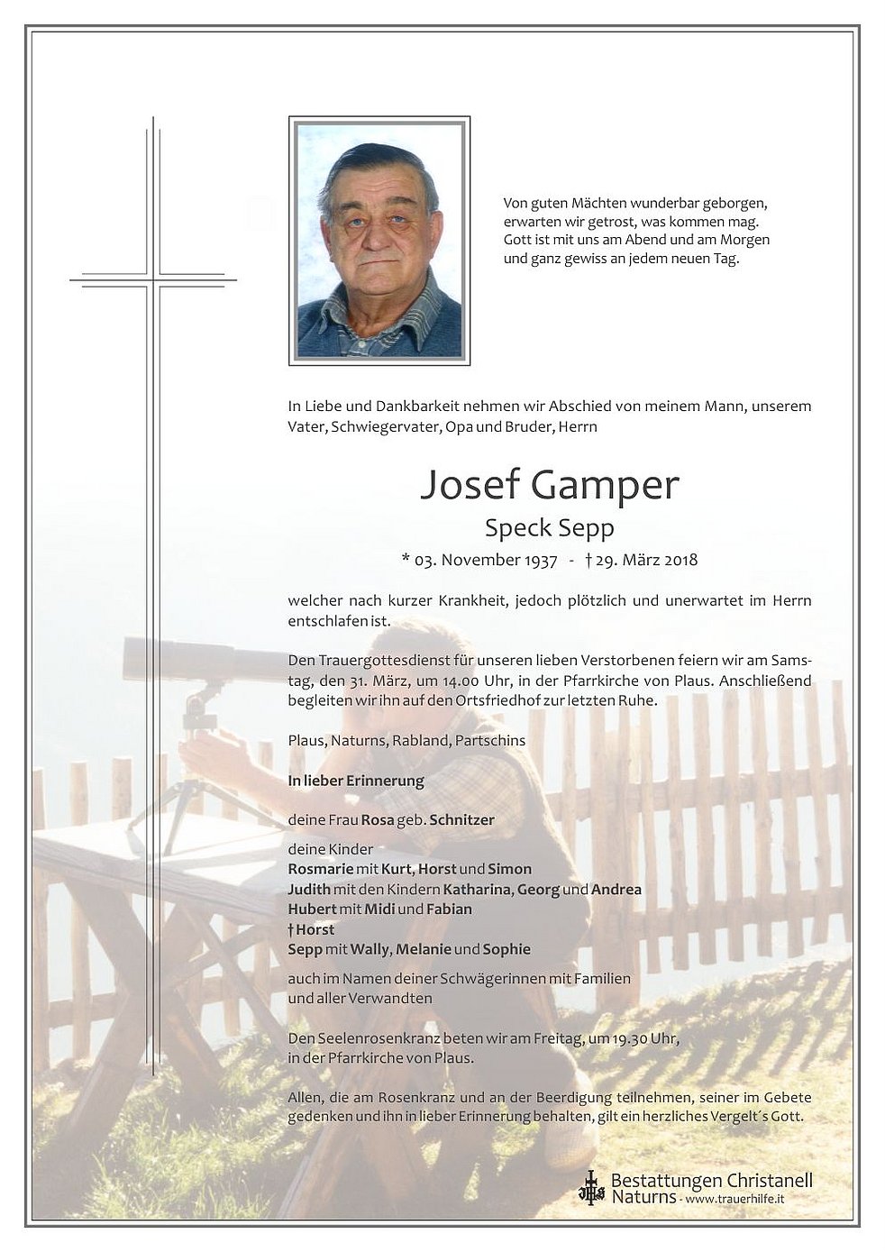 Den Trauergottesdienst für unseren lieben Verstorbenen feiern wir am Samstag, den 31. März, um 14.00 Uhr, in der Pfarrkirche von Plaus. Anschließend begleiten wir ihn auf den Ortsfriedhof zur letzten Ruhe.