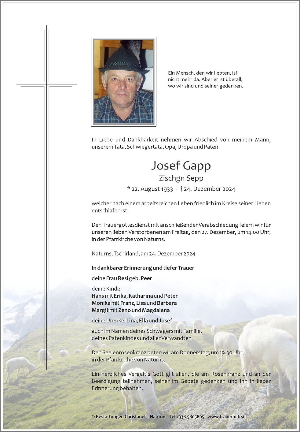 Den Trauergottesdienst mit anschließender Verabschiedung feiern wir für unseren lieben Verstorbenen am Freitag, den 27. Dezember, um 14.00 Uhr, in der Pfarrkirche von Naturns.