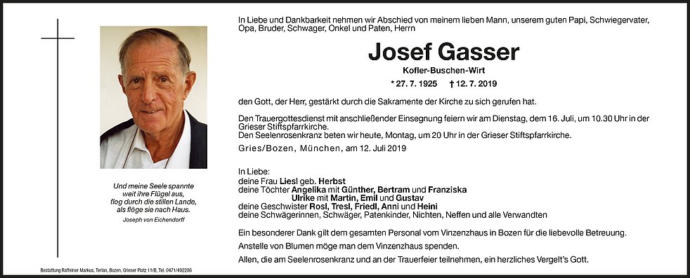 Den Trauergottesdienst mit anschließender Einsegnung feiern wir am Dienstag, dem 16. Juli, um 10.30 Uhr in der Grieser Stiftspfarrkirche.