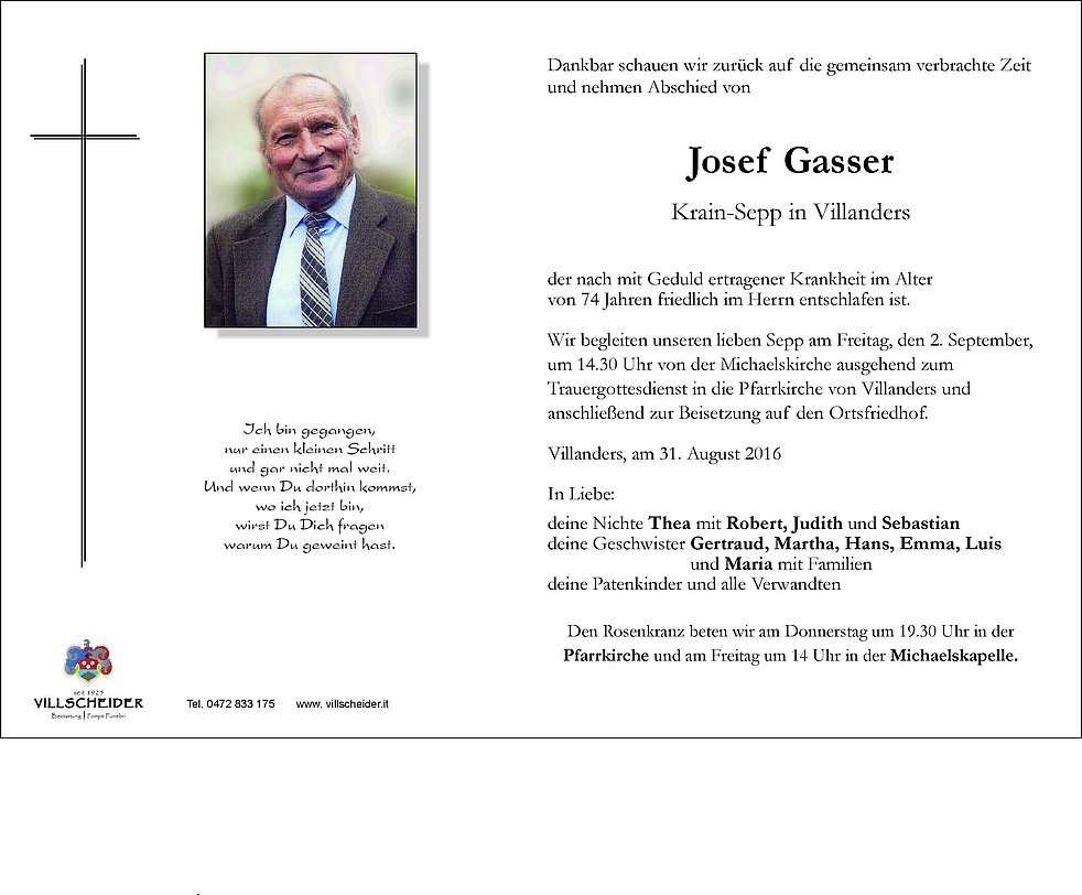 um 14.30 Uhr von der Michaelskirche ausgehend zum Trauergottesdienst in die Pfarrkirche von Villanders und anschließend zur Beisetzung auf den Ortsfriedhof.