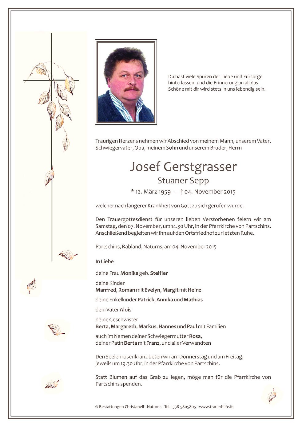Den Trauergottesdienst für unseren lieben Verstorbenen feiern wir am Samstag, den 07. November, um 14.30 Uhr, in der Pfarrkirche von Partschins. Anschließend begleiten wir ihn auf den Ortsfriedhof zur letzten Ruhe.