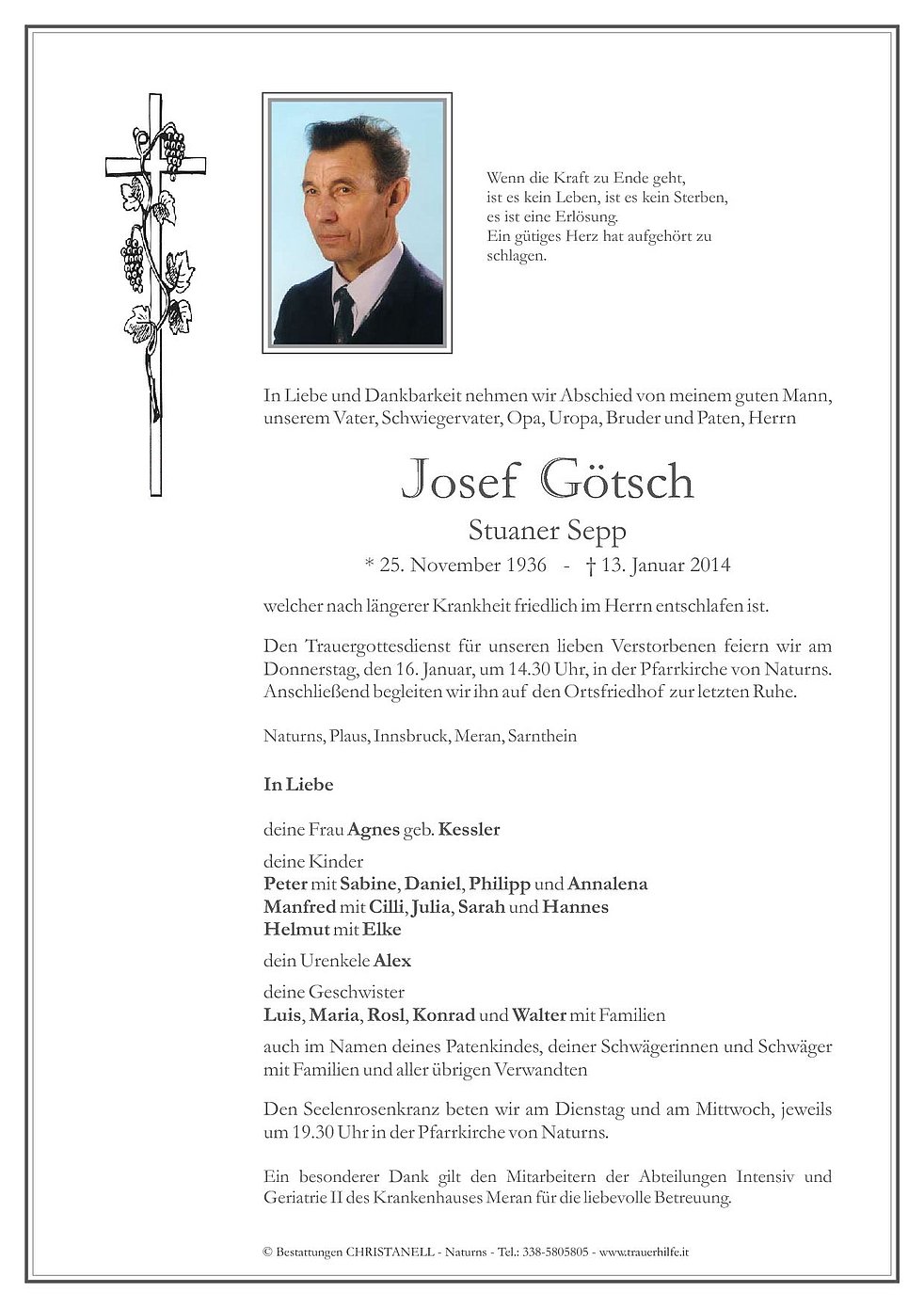 Den Trauergottesdienst für unseren lieben Verstorbenen feiern wir am Donnerstag, den 16. Januar, um 14.30 Uhr, in der Pfarrkirche von Naturns. Anschließend begleiten wir ihn auf den Ortsfriedhof zur letzten Ruhe.
