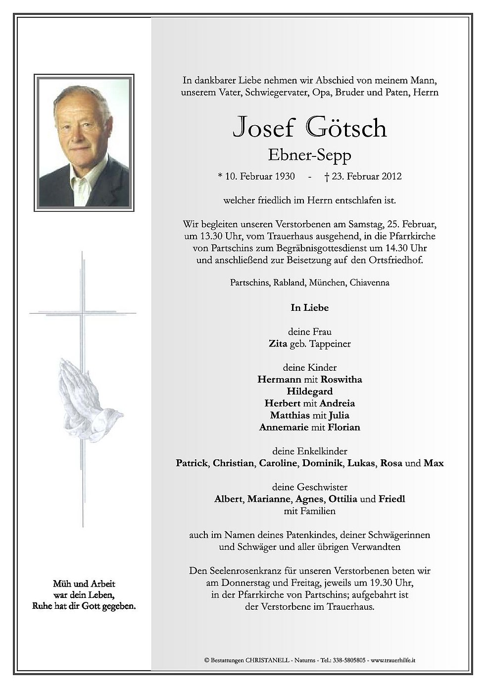 Wir begleiten unseren Verstorbenen am Samstag, 25. Februar, um 13.30 Uhr, vom Trauerhaus ausgehend, in die Pfarrkirche von Partschins zum Begräbnisgottesdienst um 14.30 Uhr und anschließend zur Beisetzung auf den Ortsfriedhof.