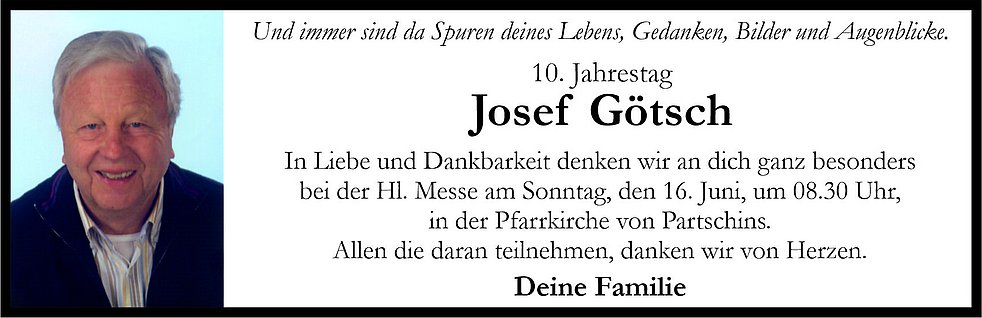 Was man tief im Herzen besitzt, kann man durch den Tod nicht verlieren. In stiller Trauer und Dankbarkeit nehmen wir Abschied von meinem Mann, unserem Tata, Schwiegervater, Opa, Bruder und Paten, Herrn Götsch Josef Schusterhansen Bibi * 02. Februar 1940 - † 17. Juni 2014 welcher friedlich im Herrn entschlafen ist. Den Trauergottesdienst für unseren lieben Verstorbenen feiern wir am Samstag, den 21. Juni, um 14.30 Uhr, in der Pfarrkirche von Partschins. Anschließend begleiten wir ihn auf den Ortsfriedhof zur letzten Ruhe. Partschins, Innsbruck, Lana, S. Giorgio, Trient, Feldkirch In Liebe deine Frau Johanna geb. Fischer deine Kinder Markus mit Manuela, Emma und Lorenz Thea mit Hanspeter und Lara deine Geschwister Hans, Meinrad, Hanni, Steffi und Erich mit Familien auch im Namen deiner Patenkinder, deiner Schwägerin und deiner Schwäger mit Familien und aller übrigen Verwandten Den Seelenrosenkranz beten wir am Donnerstag und am Freitag, jeweils um 20.00 Uhr, in der Pfarrkirche von Partschins. Allen, die an den Rosenkränzen und der Beerdigung teilnehmen, gilt unser herzlichster Dank.