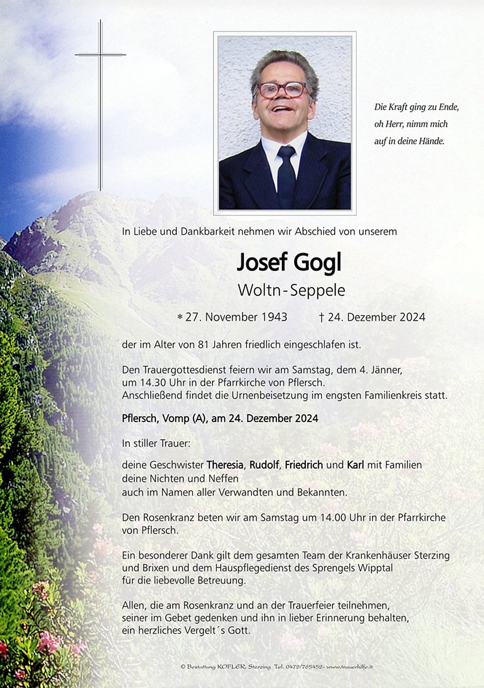 Den Trauergottesdienst feiern wir am Samstag, dem 4. Jänner, um 14.30 Uhr in der Pfarrkirche von Pflersch. Anschließend findet die Urnenbeisetzung im engsten Familienkreis statt.