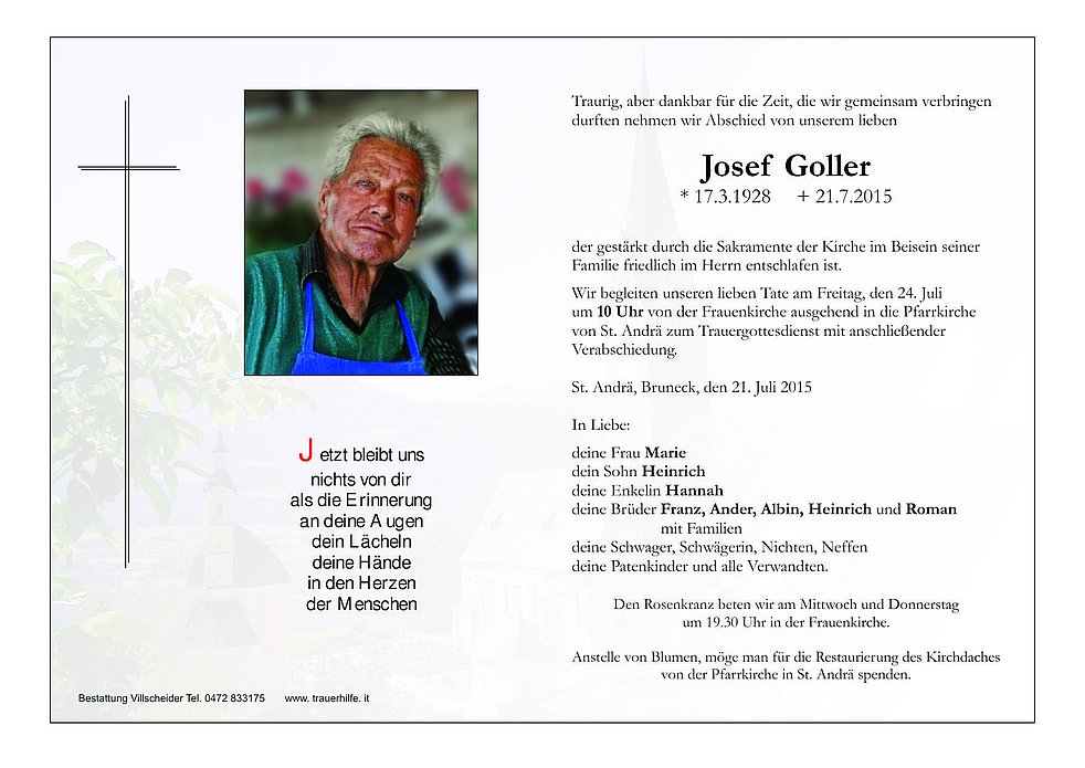 Anstelle von Blumen, möge man für die Restaurierung des Kirchdaches von der Pfarrkirche in St. Andrä spenden.