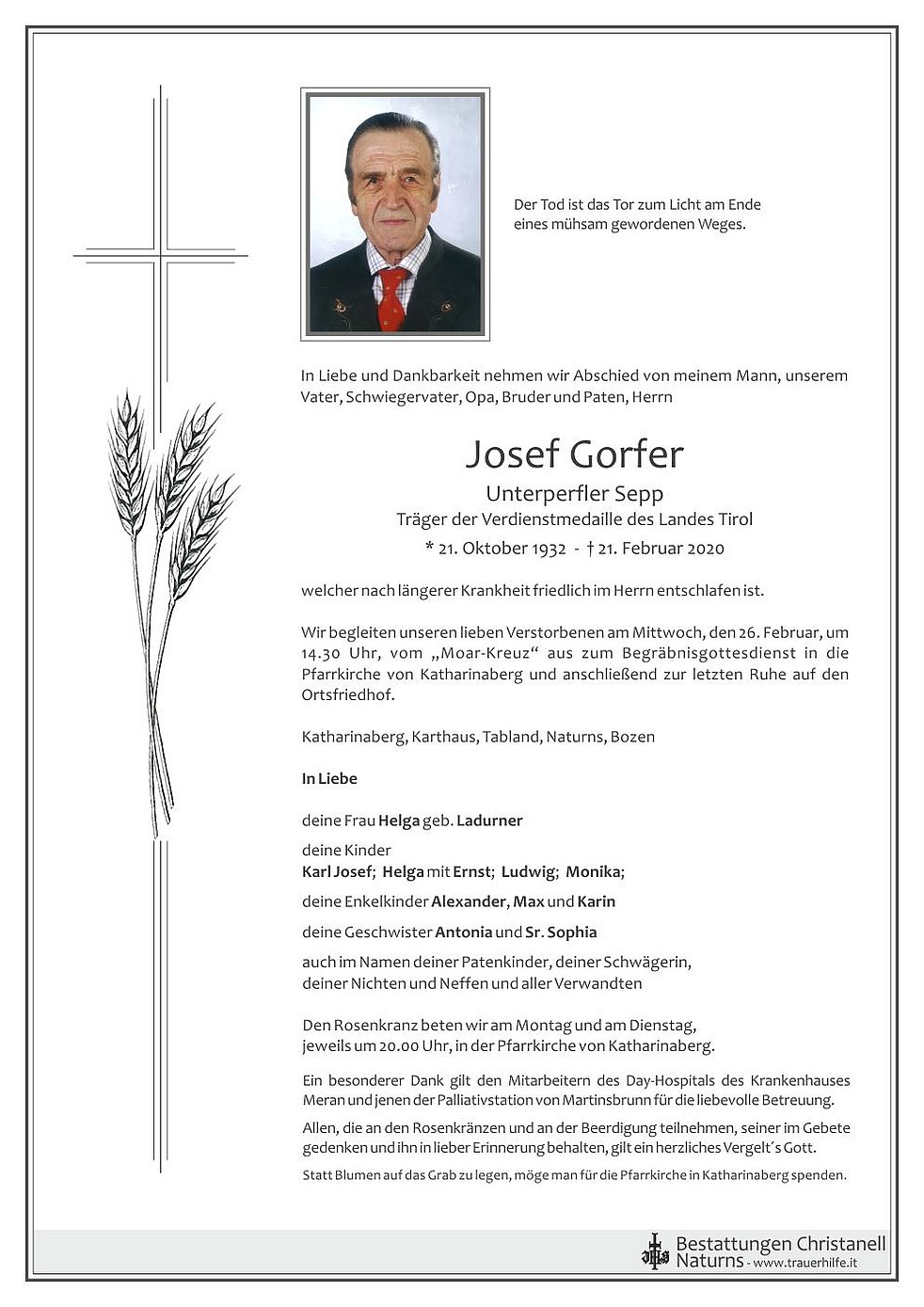 Wir begleiten unseren lieben Verstorbenen am Mittwoch, den 26. Februar, um 14.30 Uhr, vom „Moar-Kreuz“ aus zum Begräbnisgottesdienst in die Pfarrkirche von Katharinaberg und anschließend zur letzten Ruhe auf den Ortsfriedhof.