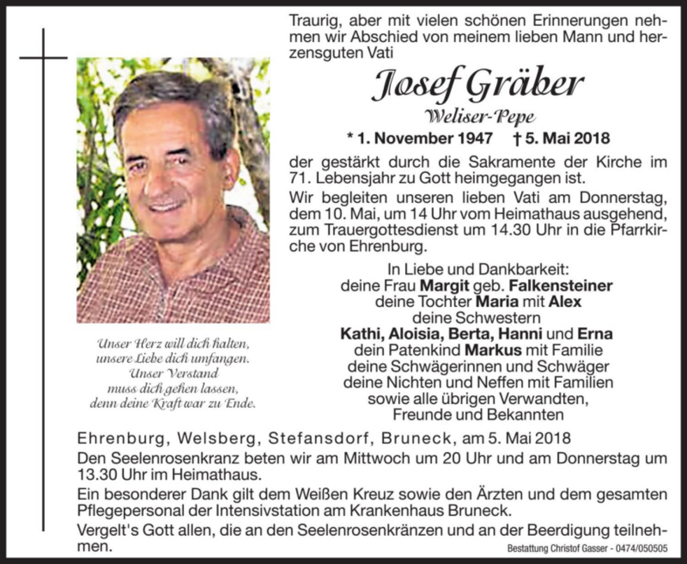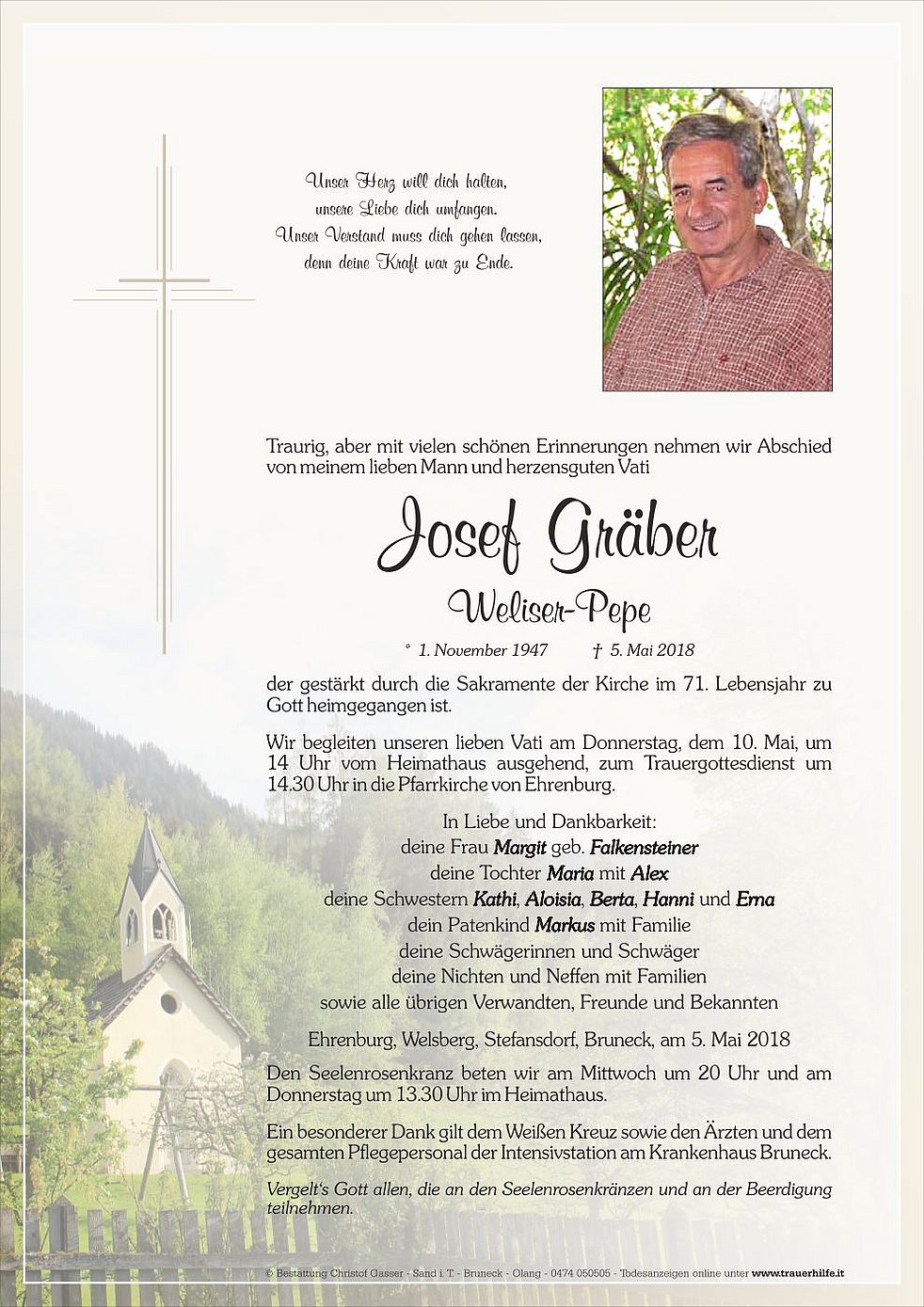 Wir begleiten unseren lieben Vati am Donnerstag, dem 10. Mai, um 14 Uhr vom Heimathaus ausgehend, zum Trauergottesdienst um 14.30 Uhr in die Pfarrkirche von Ehrenburg.