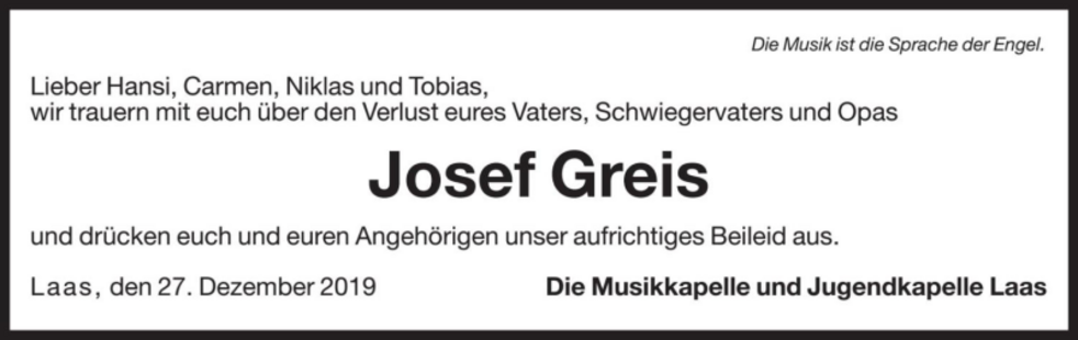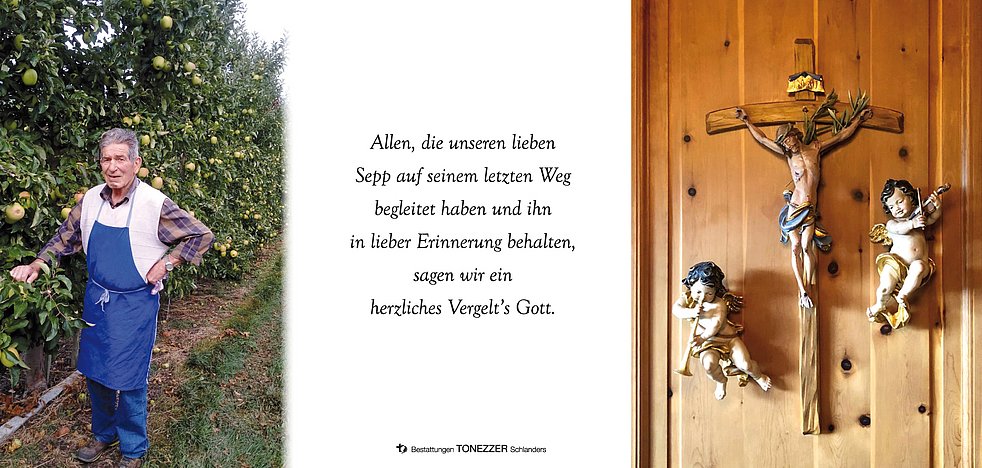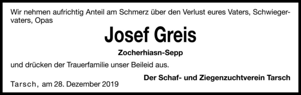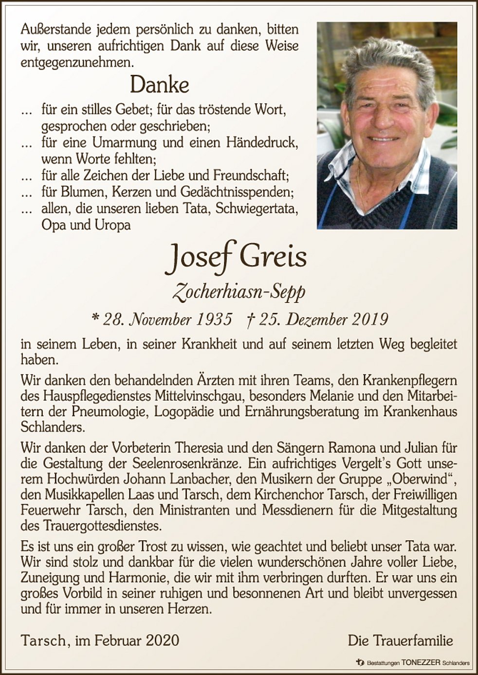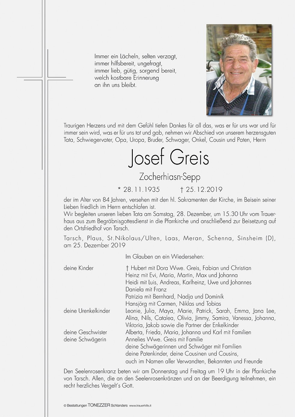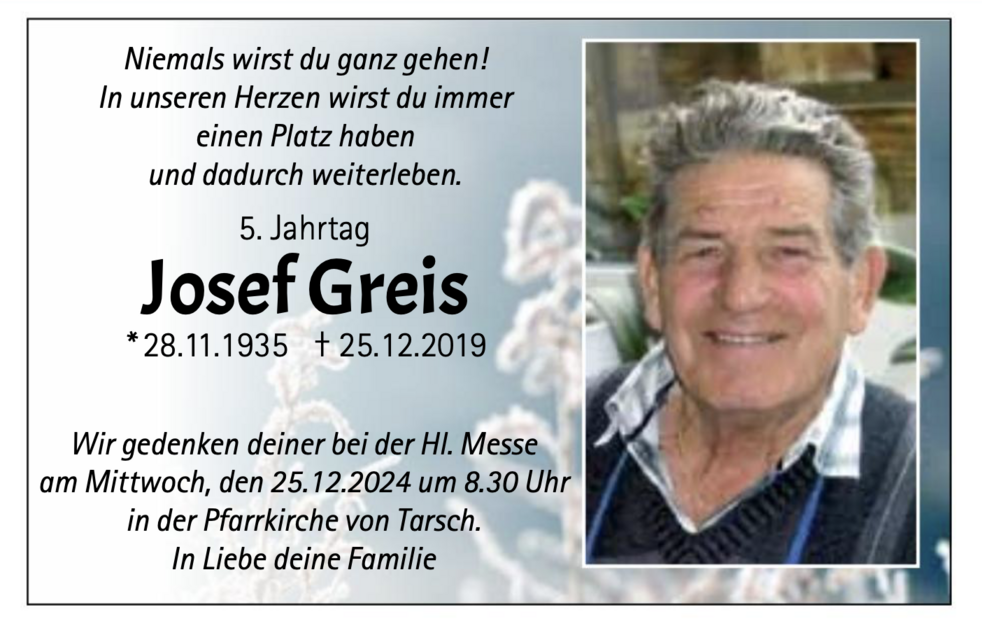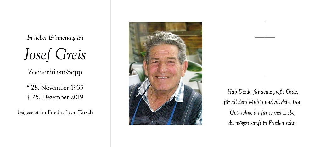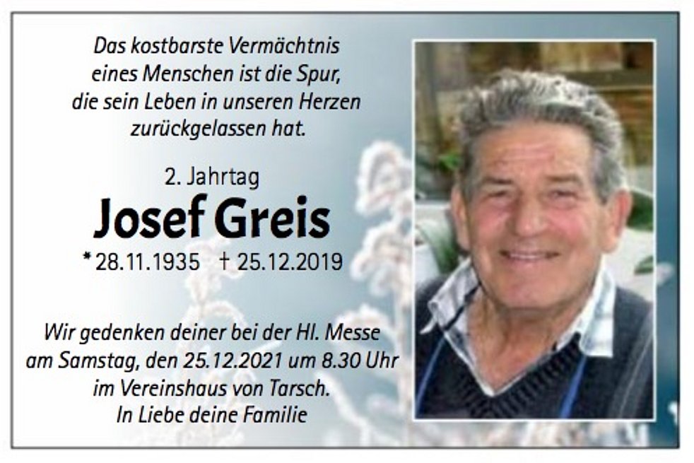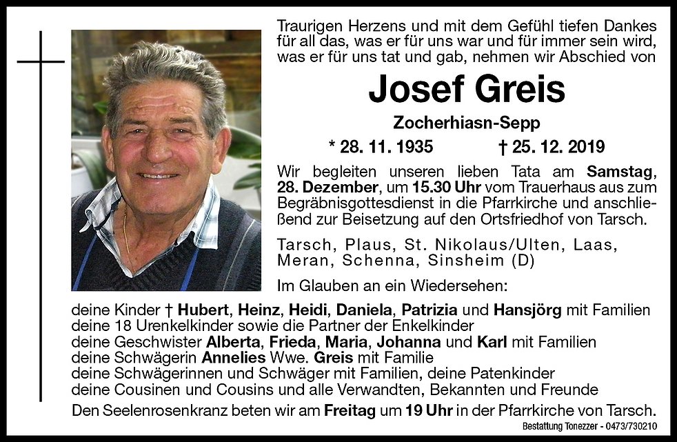 Wir begleiten unseren lieben Tata am Samstag, 28. Dezember, um 15.30 Uhr vom Trauerhaus aus zum Begräbnisgottesdienst in die Pfarrkirche und anschließend zur Beisetzung auf den Ortsfriedhof von Tarsch.