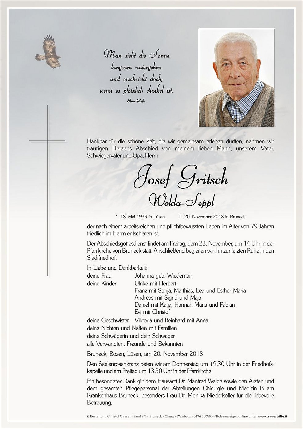 Der Abschiedsgottesdienst findet am Freitag, dem 23. November, um 14 Uhr in der Pfarrkirche von Bruneck statt. Anschließend begleiten wir ihn zur letzten Ruhe in den Stadtfriedhof.