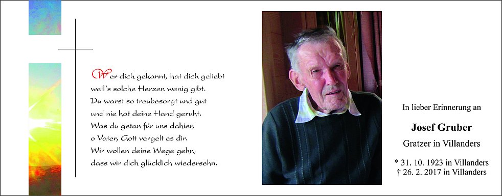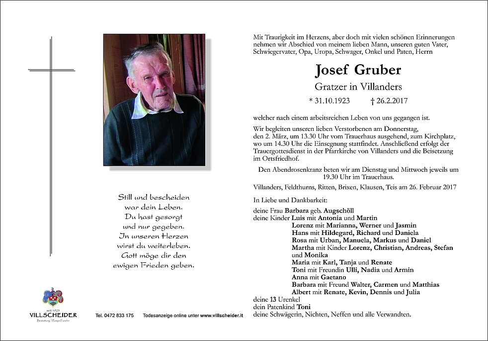 den 2. März, um 13.30 Uhr vom Trauerhaus ausgehend, zum Kirchplatz, wo um 14.30 Uhr die Einsegnung stattfindet. Anschließend erfolgt der Trauergottesdienst in der Pfarrkirche von Villanders und die Beisetzung