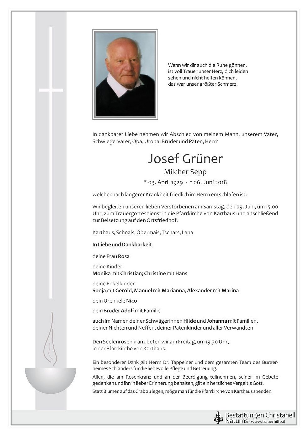 Wir begleiten unseren lieben Verstorbenen am Samstag, den 09. Juni, um 15.00 Uhr, zum Trauergottesdienst in die Pfarrkirche von Karthaus und anschließend zur Beisetzung auf den Ortsfriedhof.