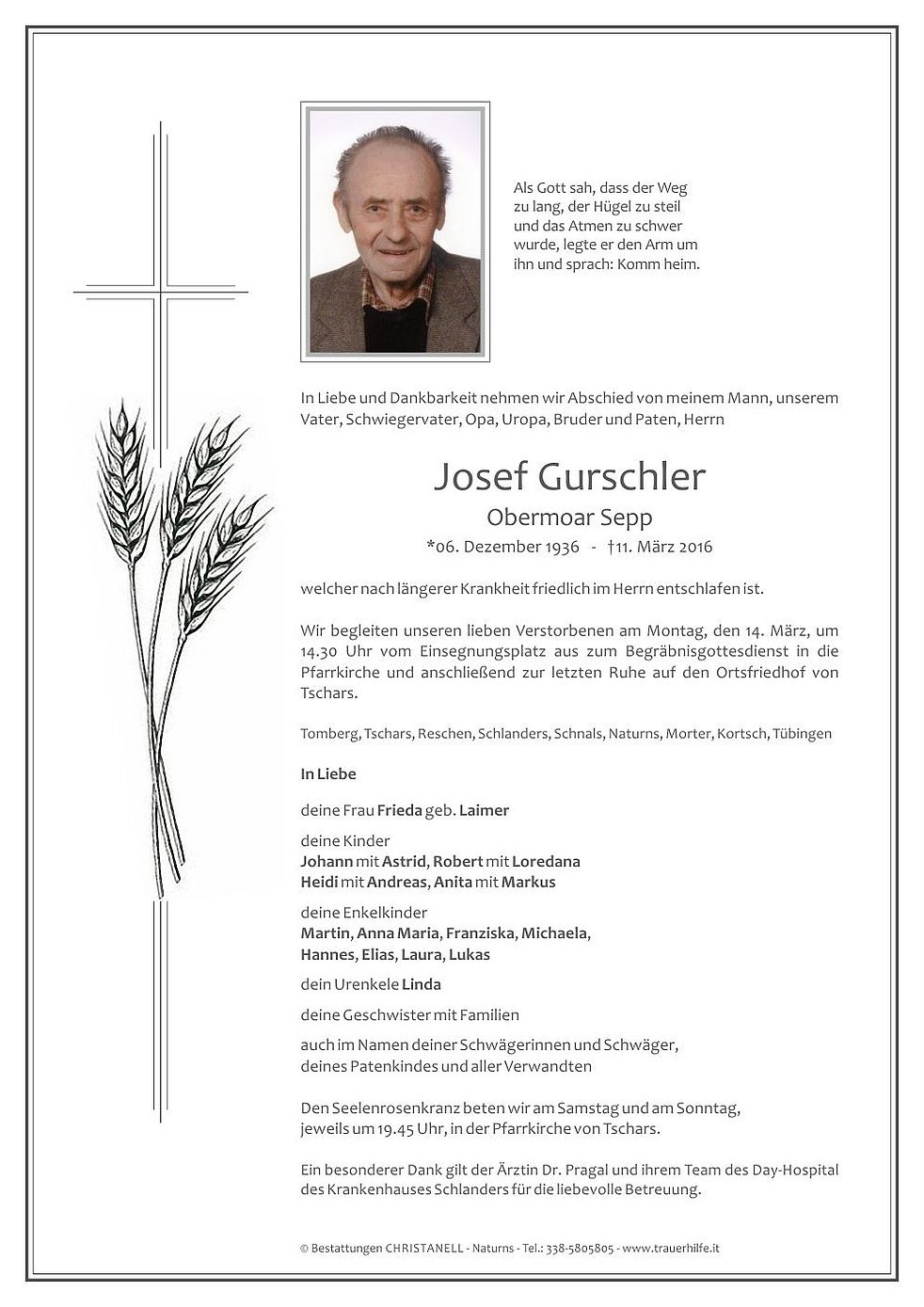 Wir begleiten unseren lieben Verstorbenen am Montag, den 14. März, um 14.30 Uhr vom Einsegnungsplatz aus zum Begräbnisgottesdienst in die Pfarrkirche und anschließend zur letzten Ruhe auf den Ortsfriedhof von Tschars.
