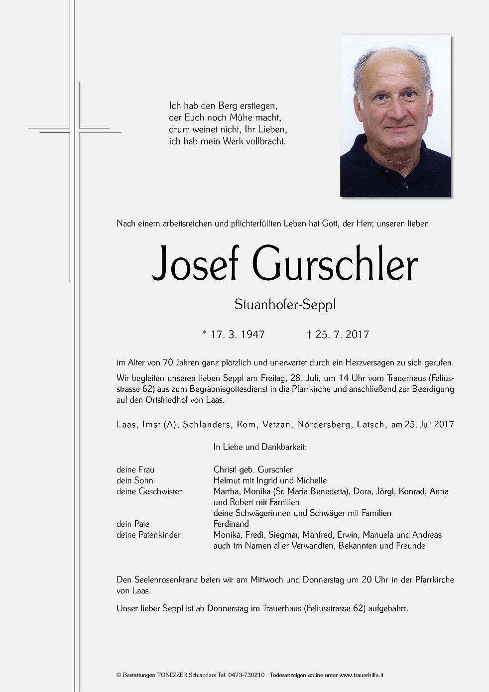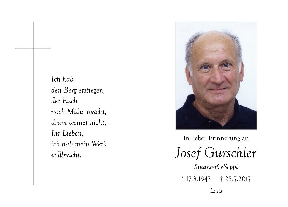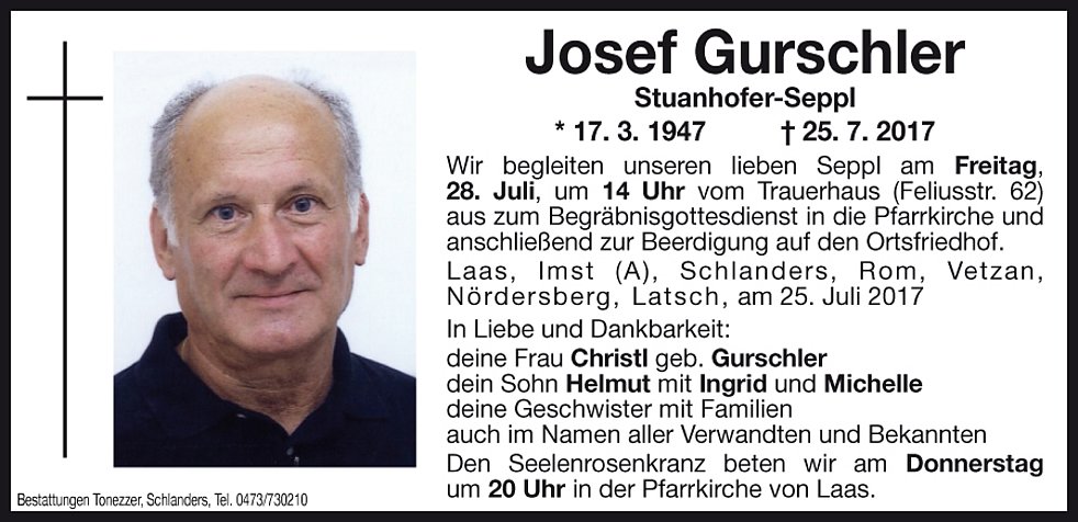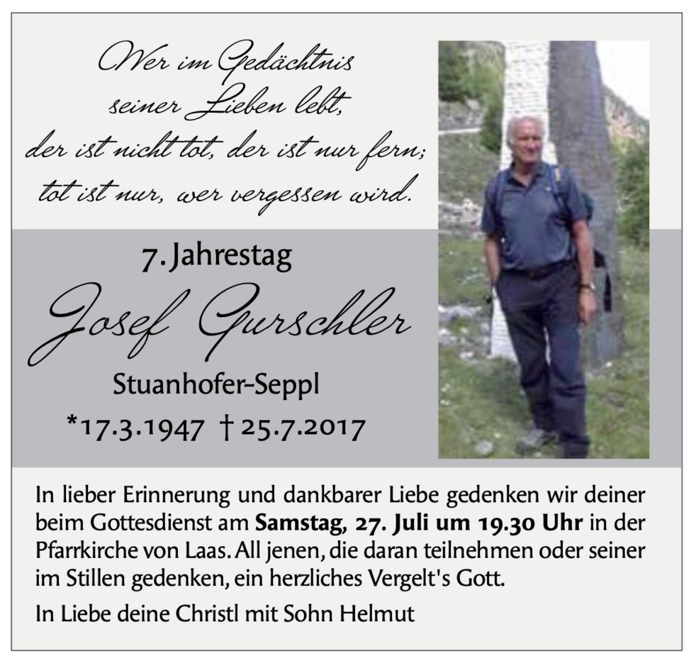 Wir begleiten unseren lieben Seppl am Freitag, 28. Juli, um 14 Uhr vom Trauerhaus (Felius-strasse 62) aus zum Begräbnisgottesdienst in die Pfarrkirche und anschließend zur Beerdigung auf den Ortsfriedhof von Laas.