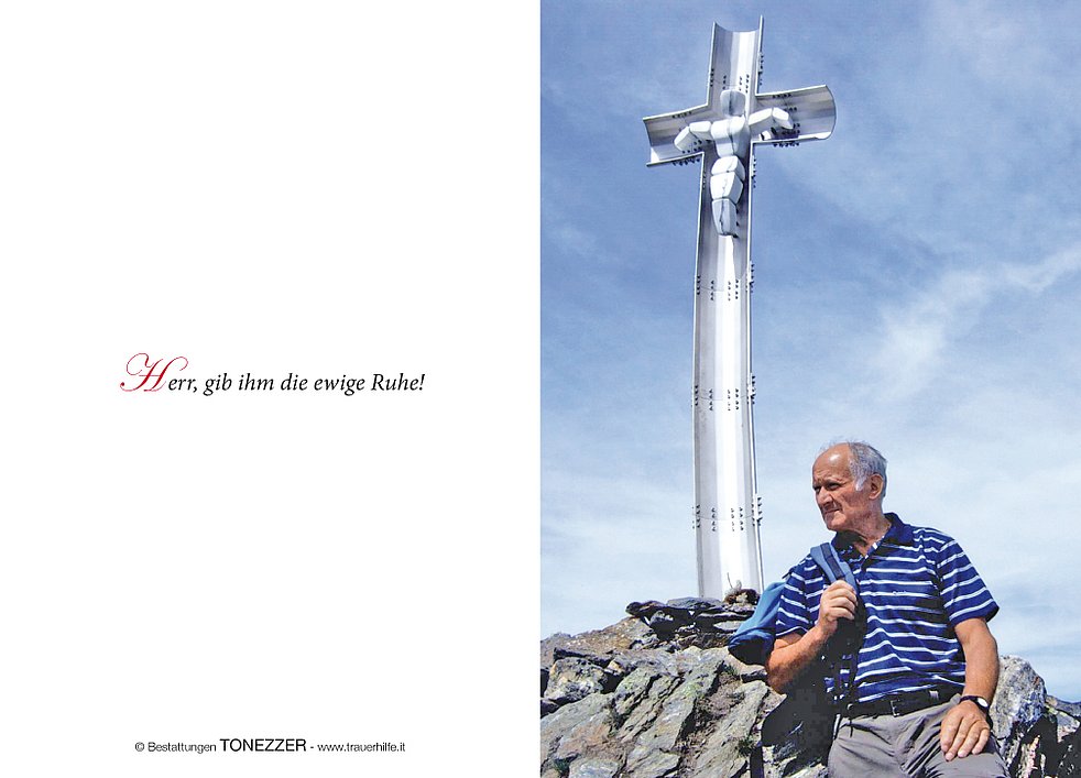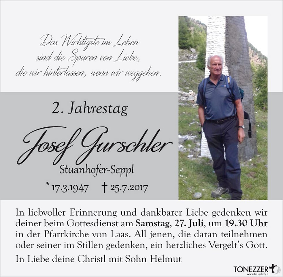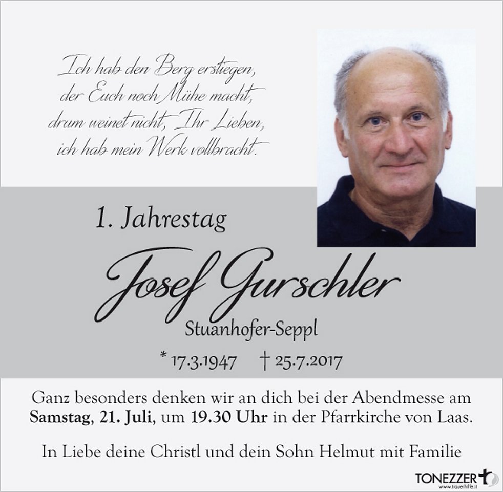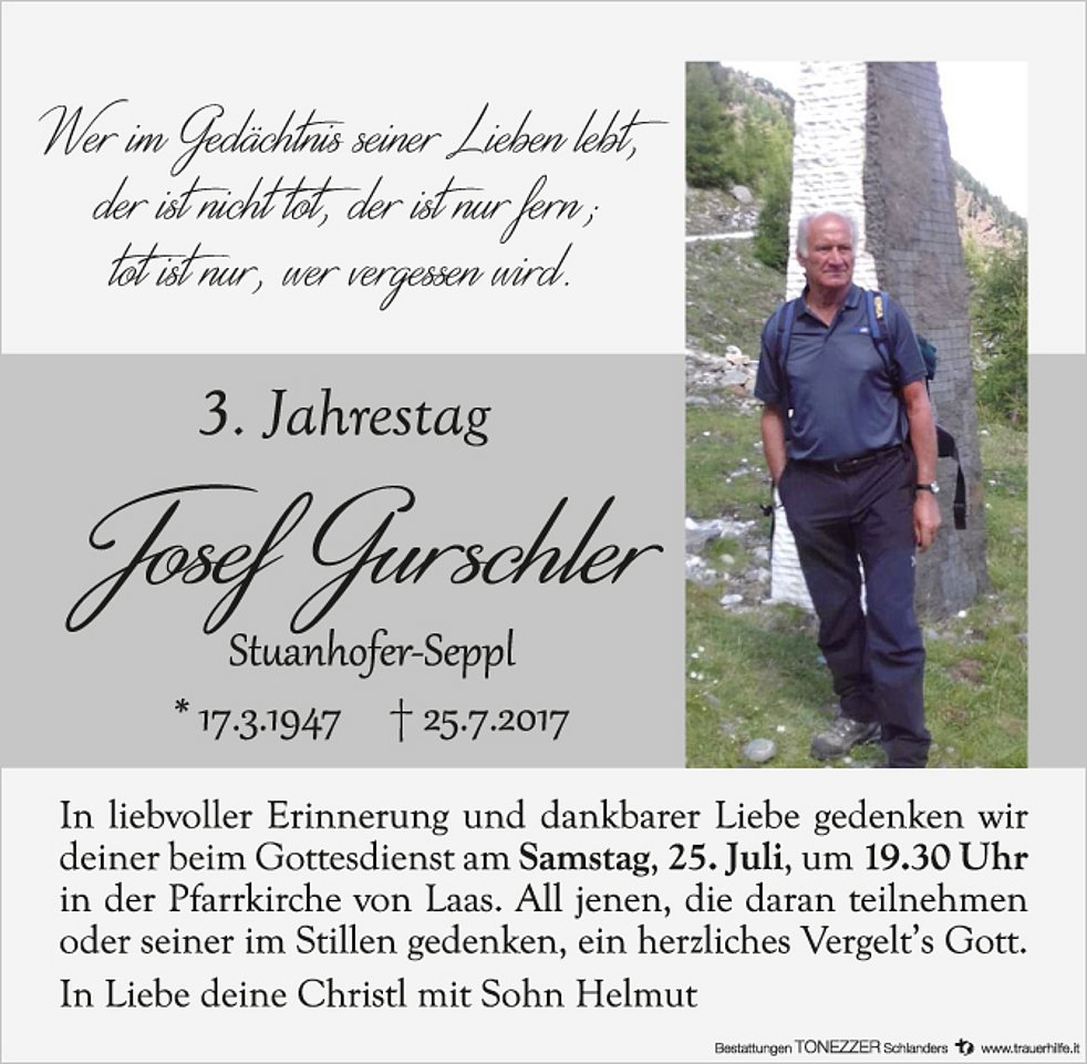 Wir begleiten unseren lieben Seppl am Freitag, 28. Juli, um 14 Uhr vom Trauerhaus (Felius-strasse 62) aus zum Begräbnisgottesdienst in die Pfarrkirche und anschließend zur Beerdigung auf den Ortsfriedhof von Laas.