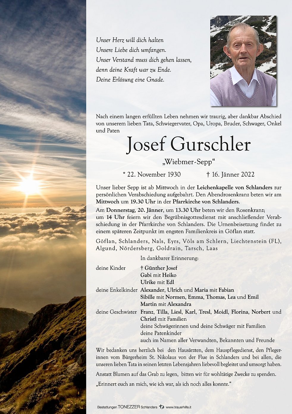 Wir bedanken uns herzlich bei den Hausärzten, dem Hauspflegedienst, den Pflegerinnen vom Bürgerheim St. Nikolaus von der Flue in Schlanders und bei allen, die unseren lieben Tata in seinen letzten Lebensjahren liebevoll begleitet und umsorgt haben.