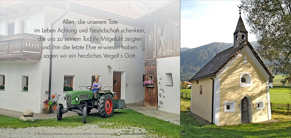 Wir danken den Ärzten und dem Pflegepersonal der Abteilung Palliativ am Krankenhaus Bruneck sowie dem Team des Sanitäts- und Sozialsprengels für die fürsorgliche Betreuung.