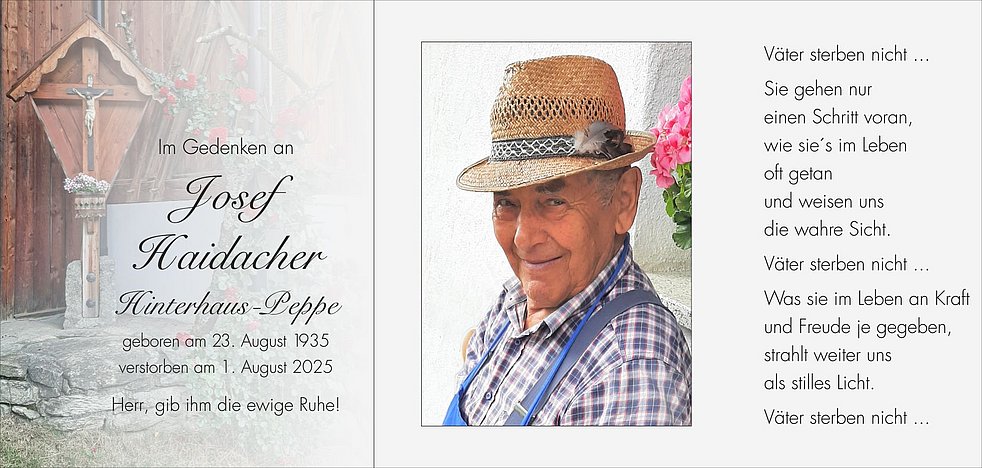 Ein erfülltes, arbeitsreiches Leben voller Liebe und Fürsorge für die Familie hat sich vollendet. In Dankbarkeit nehmen wir Abschied von meinem lieben Mann, unserem Tate, Schwiegervater und Opa, Herrn