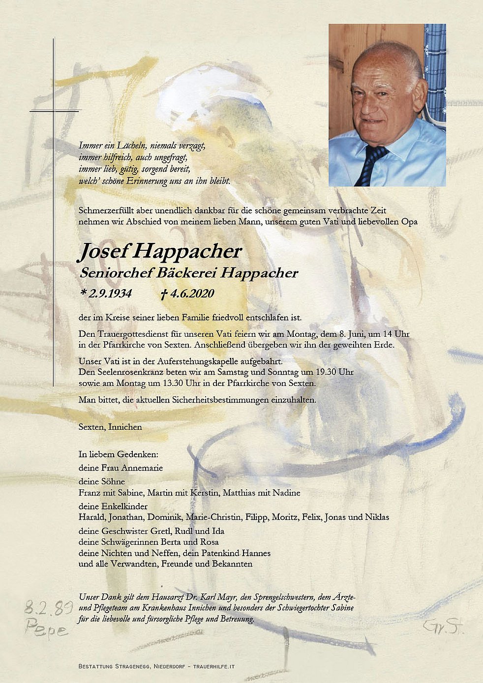 Den Trauergottesdienst für unseren Vati feiern wir am Montag, dem 8. Juni, um 14 Uhr in der Pfarrkirche von Sexten. Anschließend übergeben wir ihn der geweihten Erde.
