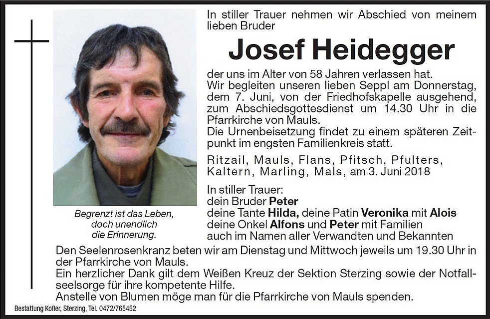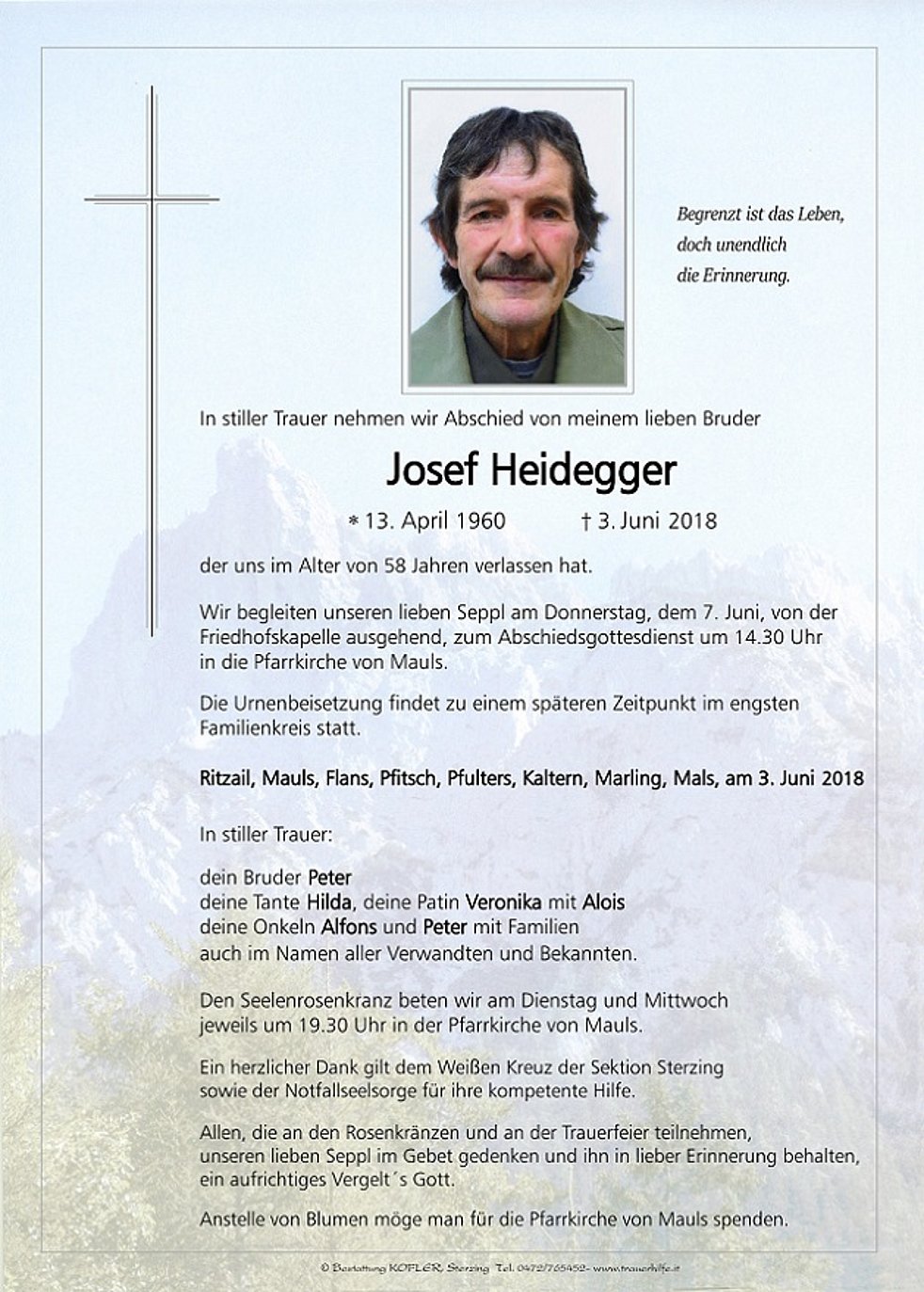 Wir begleiten unseren lieben Seppl am Donnerstag, dem 7. Juni, von der Friedhofskapelle ausgehend, zum Abschiedsgottesdienst um 14.30 Uhr in die Pfarrkirche von Mauls.