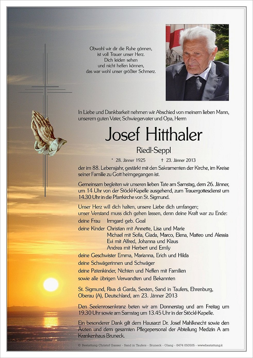 Gemeinsam begleiten wir unseren lieben Tate am Samstag, dem 26. Jänner, um 14 Uhr von der Stöckl-Kapelle ausgehend, zum Trauergottesdienst um 14.30 Uhr in die Pfarrkirche von St. Sigmund.