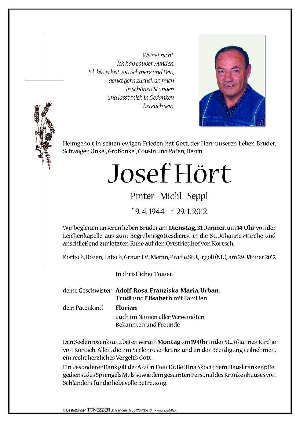 Wir begleiten unseren lieben Bruder am Dienstag, 31. Jänner, um 14 Uhr von der Leichenkapelle aus zum Begräbnisgottesdienst in die St. Johannes-Kirche und anschließend zur letzten Ruhe auf den Ortsfriedhof von Kortsch.