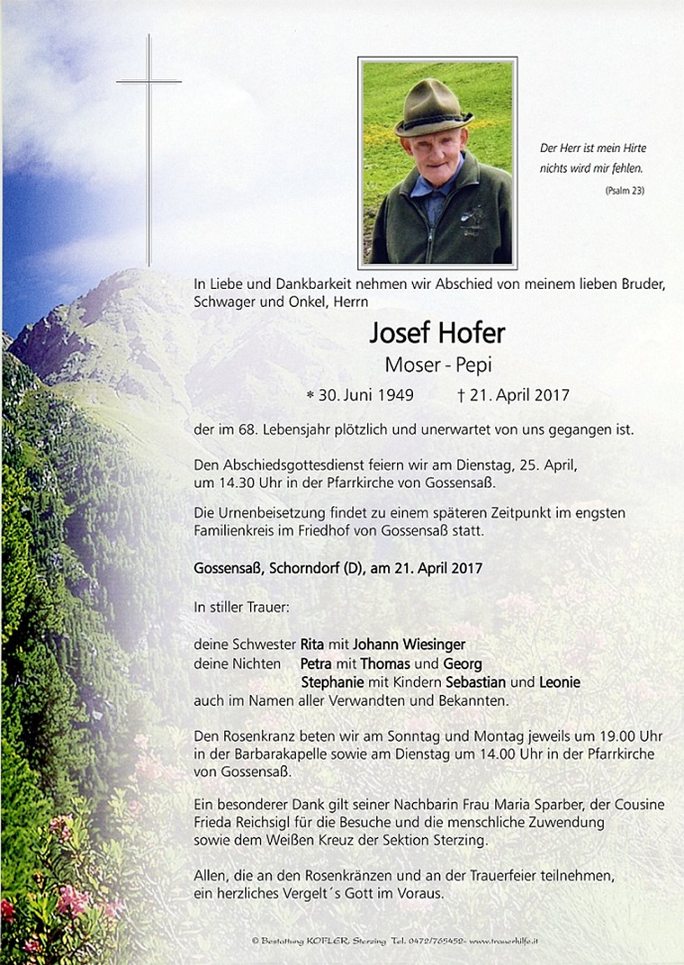 Ein besonderer Dank gilt seiner Nachbarin Frau Maria Sparber, der Cousine Frieda Reichsigl für die Besuche und die menschliche Zuwendung sowie dem Weißen Kreuz der Sektion Sterzing.