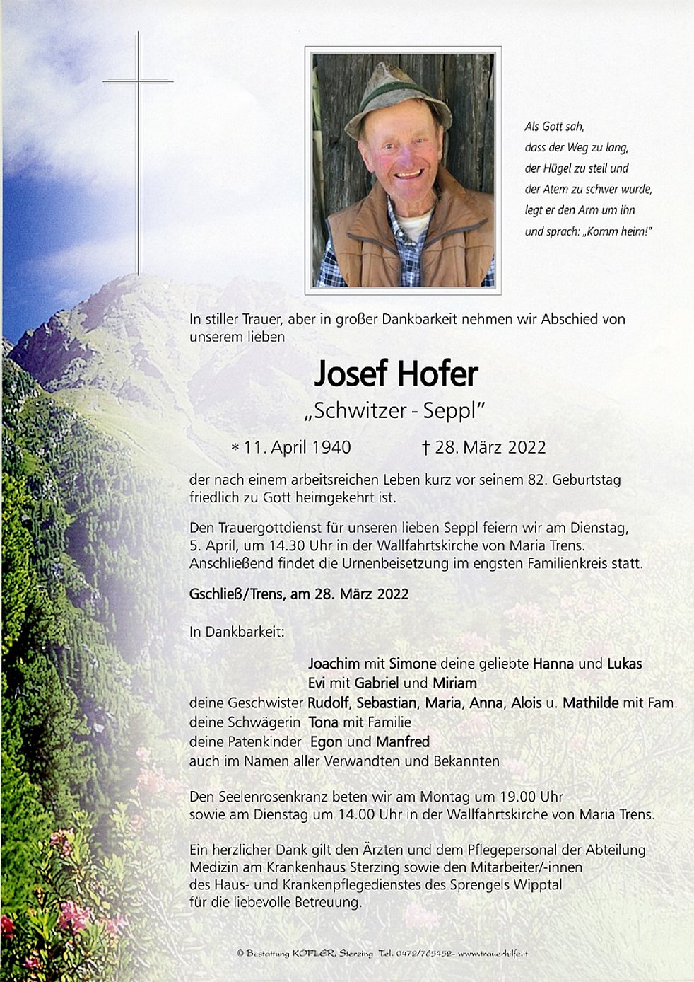 Den Trauergottdienst für unseren lieben Seppl feiern wir am Dienstag, 5. April, um 14.30 Uhr in der Wallfahrtskirche von Maria Trens. Anschließend findet die Urnenbeisetzung im engsten Familienkreis statt.