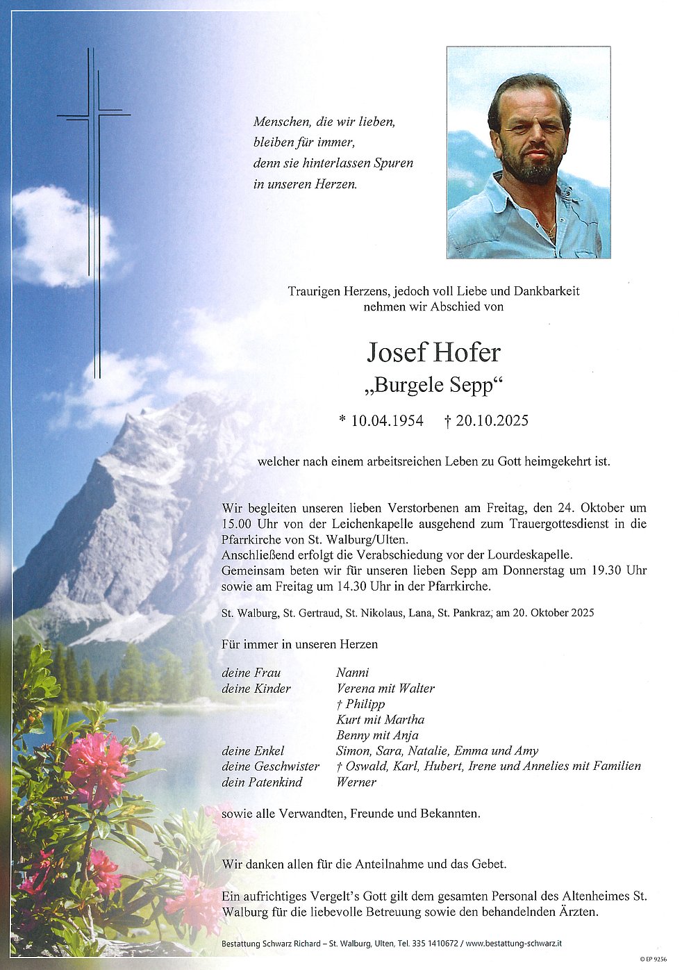 Wir begleiten unseren lieben Verstorbenen am Freitag, den 24. Oktober um 15.00 Uhr von der Leichenkapelle ausgehend zum Trauergottesdienst in die Pfarrkirche von St. Walburg/Ulten.
