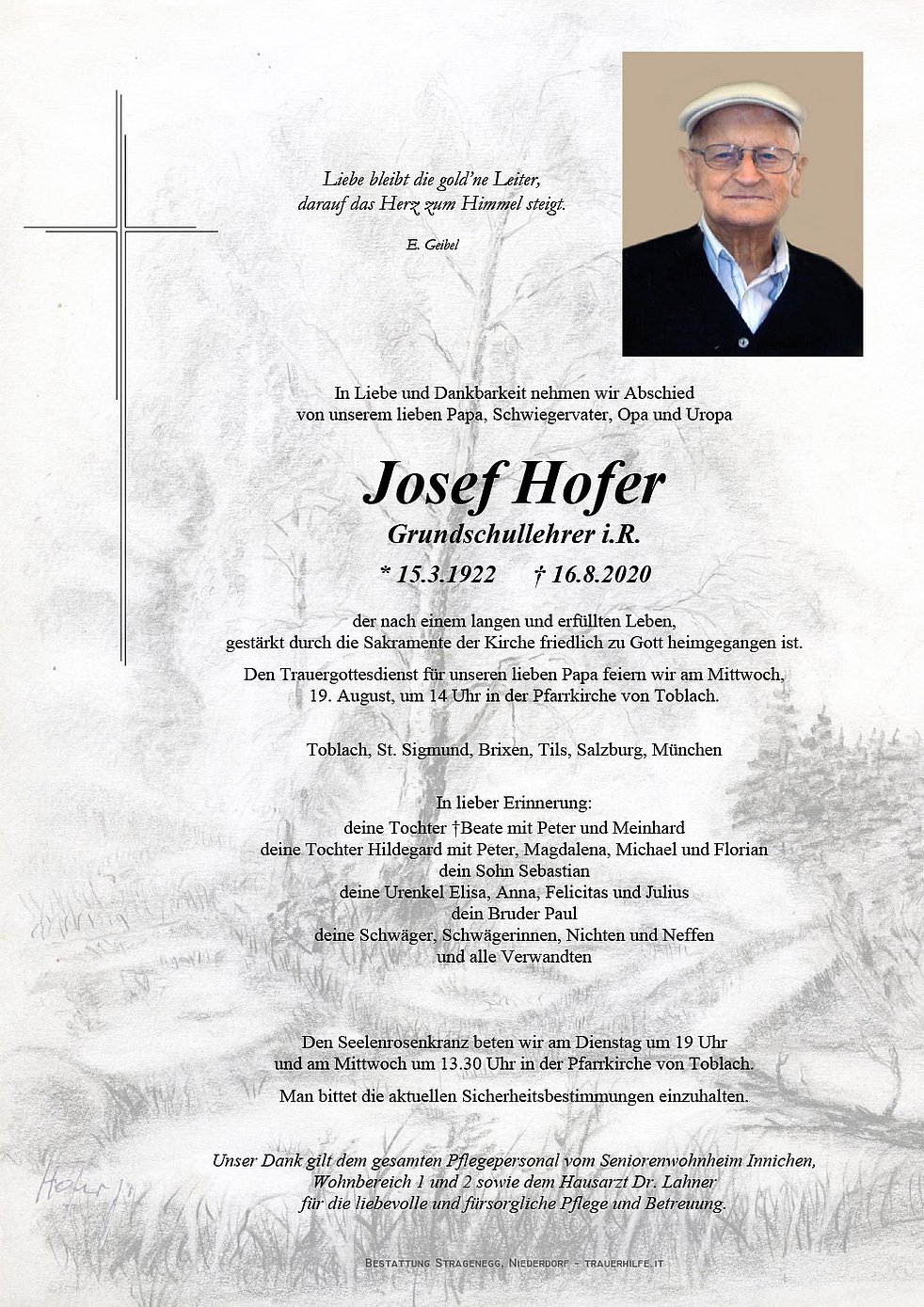 Unser Dank gilt dem gesamten Pflegepersonal vom Seniorenwohnheim Innichen, Wohnbereich 1 und 2 sowie dem Hausarzt Dr. Lahner für die liebevolle und fürsorgliche Pflege und Betreuung.