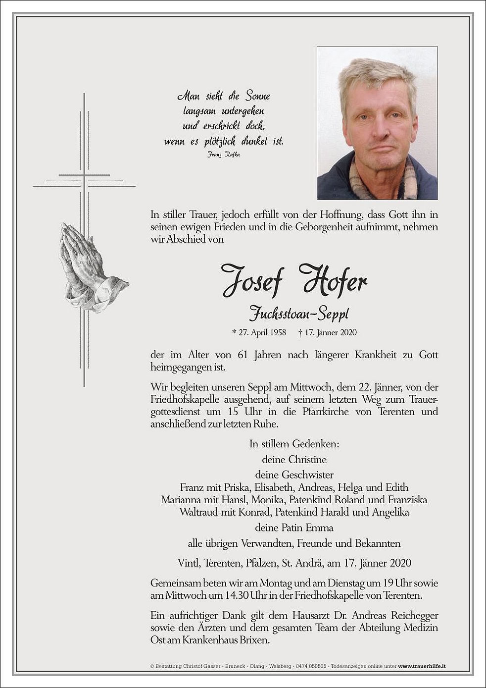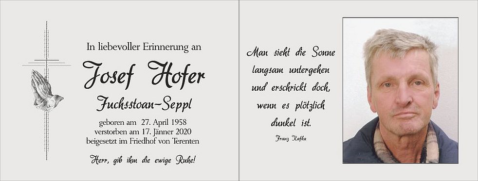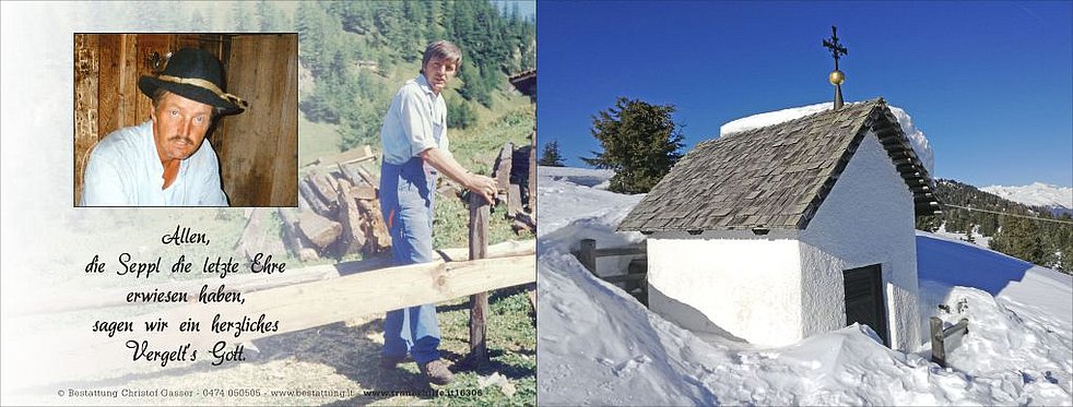 Wir begleiten unseren Seppl am Mittwoch, dem 22. Jänner, von der Friedhofskapelle ausgehend, auf seinem letzten Weg zum Trauer-gottesdienst um 15 Uhr in die Pfarrkirche von Terenten und anschließend zur letzten Ruhe.