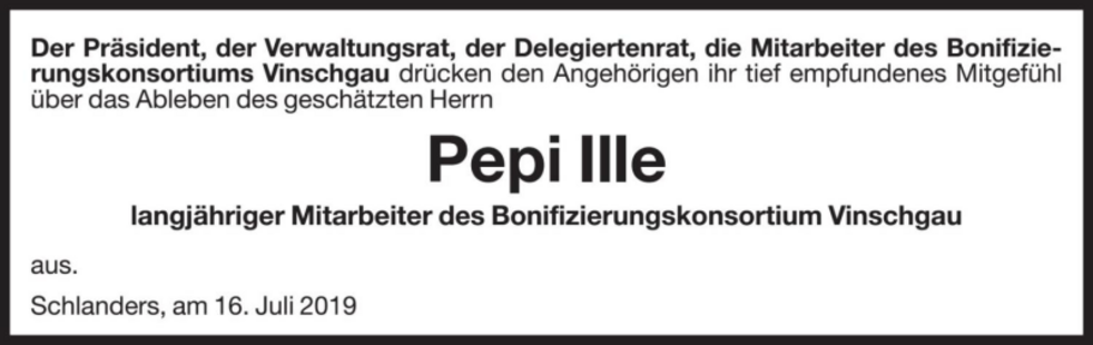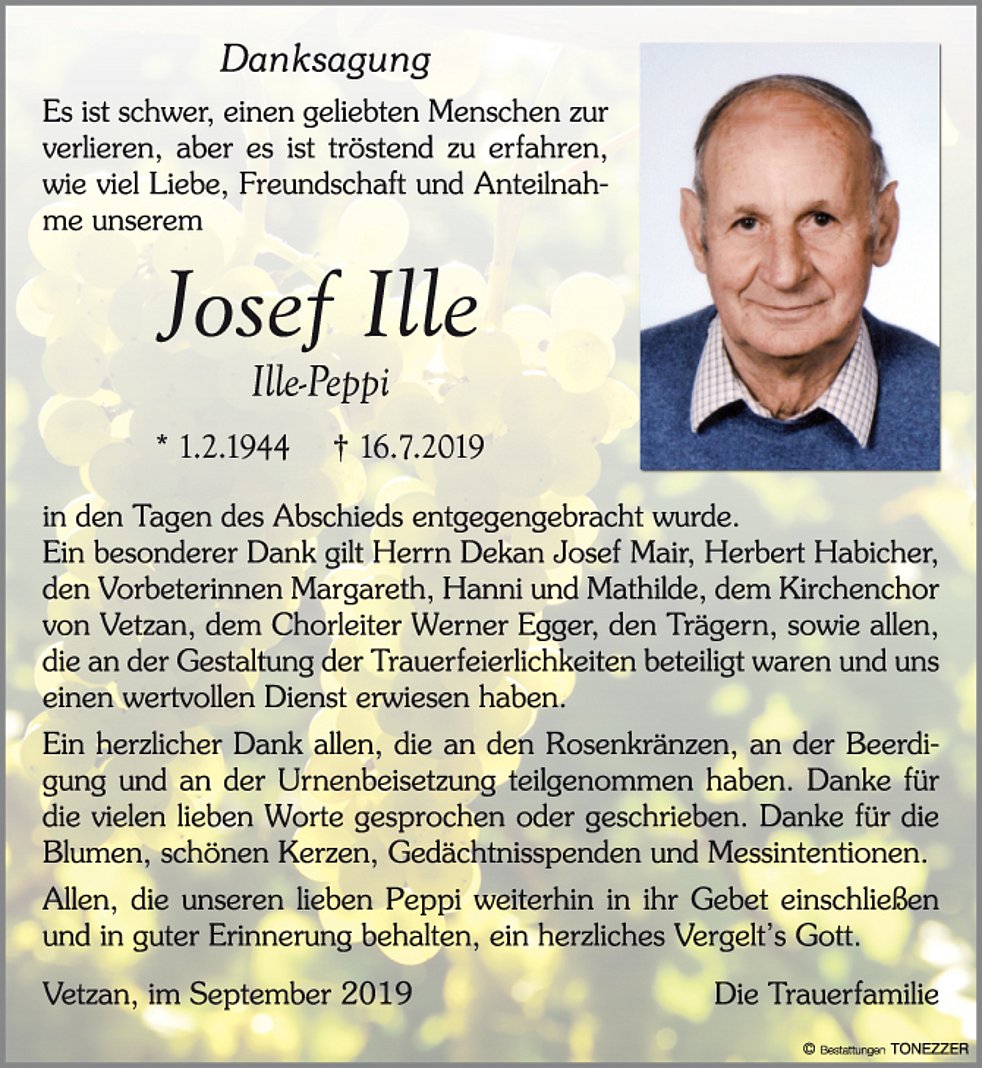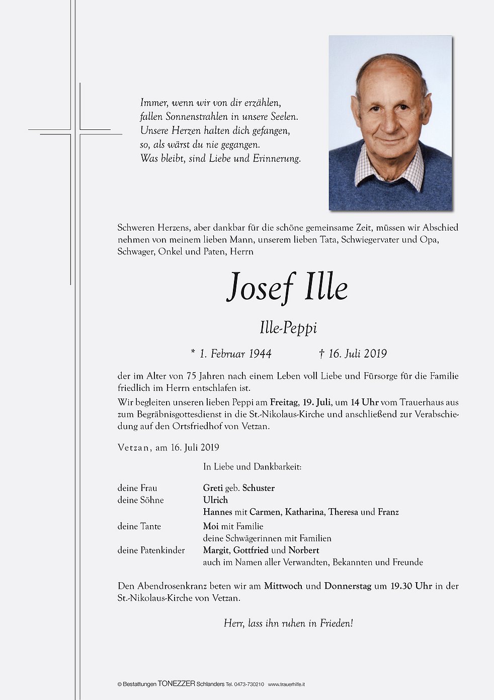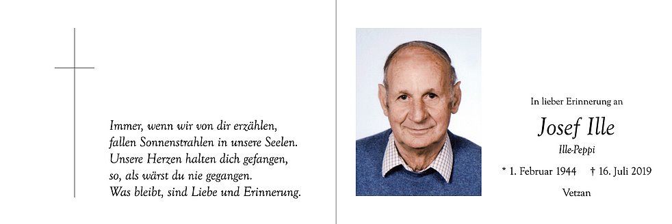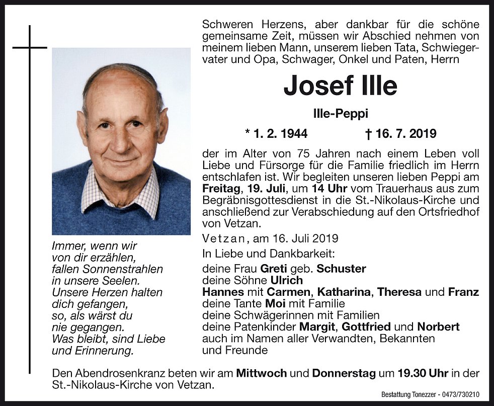 Wir begleiten unseren lieben Peppi am Freitag, 19. Juli, um 14 Uhr vom Trauerhaus aus zum Begräbnisgottesdienst in die St.-Nikolaus-Kirche und anschließend zur Verabschiedung auf den Ortsfriedhof von Vetzan.