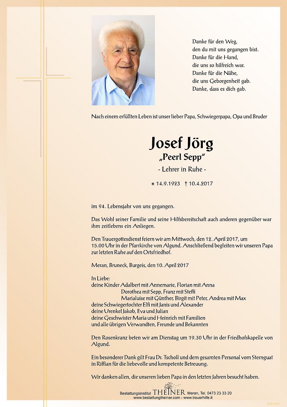Den Trauergottesdienst feiern wir am Mittwoch, den 12. April 2017, um 15.00 Uhr in der Pfarrkirche von Algund. Anschließend begleiten wir unseren Papa zur letzten Ruhe auf den Ortsfriedhof.
